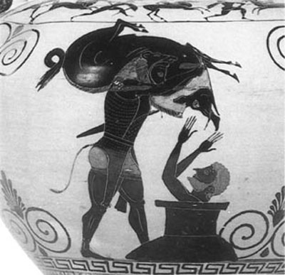 Noch viel bekannter ist die Jagd auf den erymanthischen Eber. Eber leitet sich übrigens von lateinisch "aper" ab und ist älter als die Bezeichnung Keiler, die erst seit etwa 300 Jahren verwendet wird. Es ist eine der zwölf unlösbaren Aufgaben, die Herakles gestellt bekommt und die er dennoch zu lösen versteht. Wieder geht es um ein wildes Schwein, das die Landschaft Arkadiens verwüstet. Herakles soll es fangen und lebendig nach Mykene bringen. Mit Geschrei treibt er das wilde Tier aus dem Dickicht des Waldes heraus und hetzt es, bis es im tiefen Schnee ermüdet. Er bindet das Wild mit Fesseln und trägt seine lebende Beute auf den Schultern zu König Eurystheus, der sich beim Anblick von Jäger und Beute erschreckt und sich sicherheitshalber in ein eisernes Fass zurückzieht.
