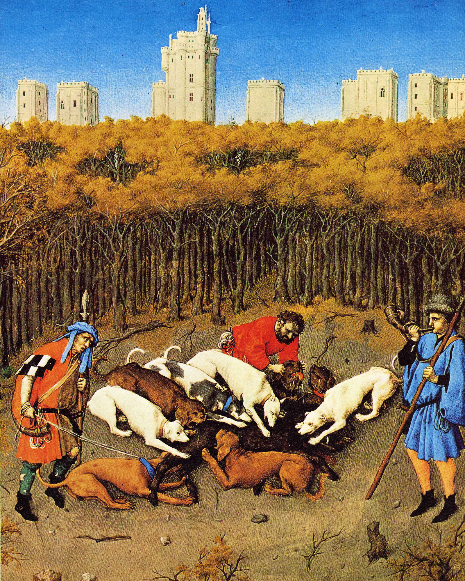 Im berühmten Stundenbuch des Herzogs von Berry ist eine solche Jagdszene mit Hunden, die ein Schwein hetzen und stellen, abgebildet (Abb. 2). Früh wurden die Adelssprösslinge in die Jagd eingeführt. Der dreizehnjährige Herzog Ulrich von Württemberg erlegte 1507 seine erste Wildsau, was Auftakt zu einer lebenslangen Jagdleidenschaft war. Diese erste herzogliche Sau wurde in Holz nachgebildet, mit dem Fell der Beute überzogen und mit einem Bewegungsmechanismus versehen. Sie kann noch heute im Schloss Urach besichtigt werden.