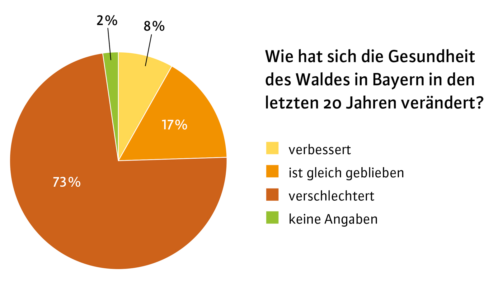 Die Gesundheit des Waldes ist für viele Menschen ein Grund zur Sorge. Drei Viertel der 3.504 Befragten (73 %) haben den Eindruck, dass sich die Gesundheit des Waldes in den letzten 20 Jahren deutlich verschlechtert hat. Für 17 % der Befragten haben sich keine Veränderungen in der Waldgesundheit ergeben; ein kleiner Teil war der Meinung, dass sich eine Verbesserung eingestellt hat (8 %) (Abbildung 2). Danach gefragt, wie sie die Gesundheit des Waldes heute einschätzen, gaben 39 % der Befragten an, dass der Zustand des Waldes schlecht sei, 44 % äußerten Bedenken. Demgegenüber schätzten 16 % der Befragten die Gesundheit des Waldes als (sehr) gut ein. Zwischen Einschätzung der Waldgesundheit und Häufigkeit der Waldbesuche gibt es keinen Zusammenhang. Ob wöchentlich oder seltener als einmal im Monat im Wald: Die Befragten schätzen die Waldgesundheit ähnlich (schlecht) ein. Insgesamt fühlen sich die Befragten eher zu wenig über den Waldzustand informiert. 53,3 % gaben an, dass sie zur Waldgesundheit in Bayern nicht gut informiert seien. Wenn es um die Waldgesundheit weltweit geht, liegt dieser Wert mit 64,1 % bei fast zwei Drittel der Befragten.