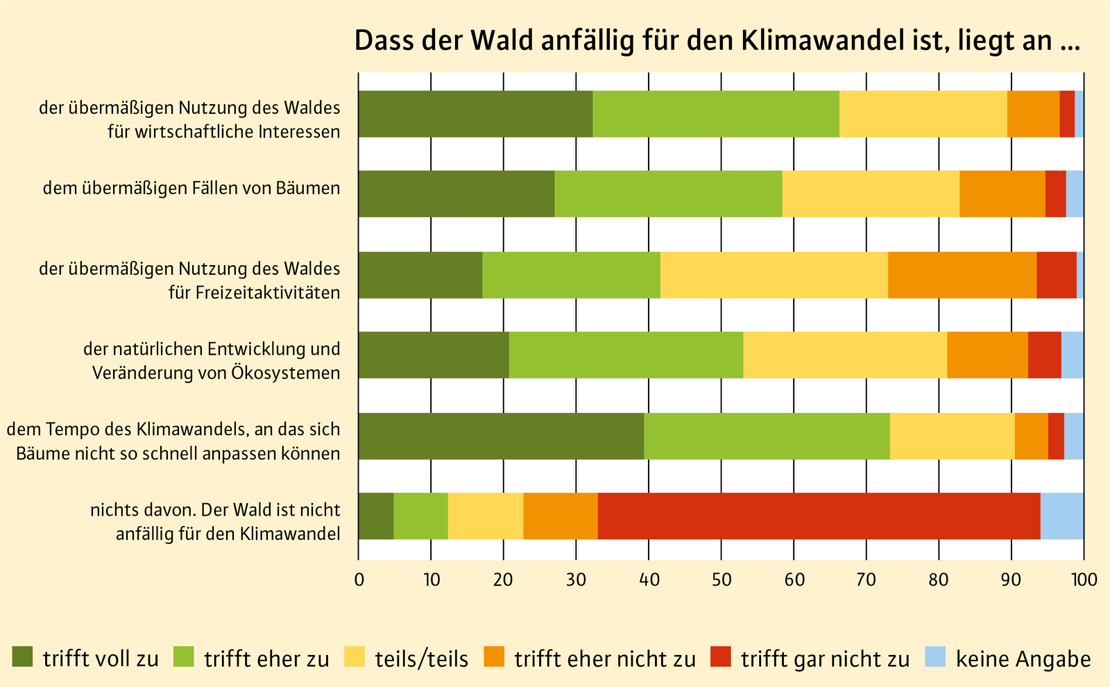 Der Klimawandel ist menschengemacht. 86,3 % der Befragten sind vom anthropogenen Klimawandel überzeugt. Zwei Drittel (65,2 %) der Befragten vertreten die Auffassung, dass wirtschaftliche Interessen und übermäßige Holznutzung den Wald anfälliger gegenüber dem Klimawandel machen, weitere 23,1 % stimmen dieser Sichtweise zum Teil zu. Eine auf Gewinnmaximierung setzende Forstwirtschaft ist aus Sicht der Bevölkerung ein wesentlicher Grund für die Anfälligkeit von Wäldern gegenüber dem Klimawandel. Gleichzeitig vertreten drei Viertel der Befragten (73,2 %) die Auffassung, dass sich Bäume nicht ausreichend an das Tempo des Klimawandels anpassen können, weitere 17,3 % stimmen dieser Aussage zum Teil zu (Abbildung 3).