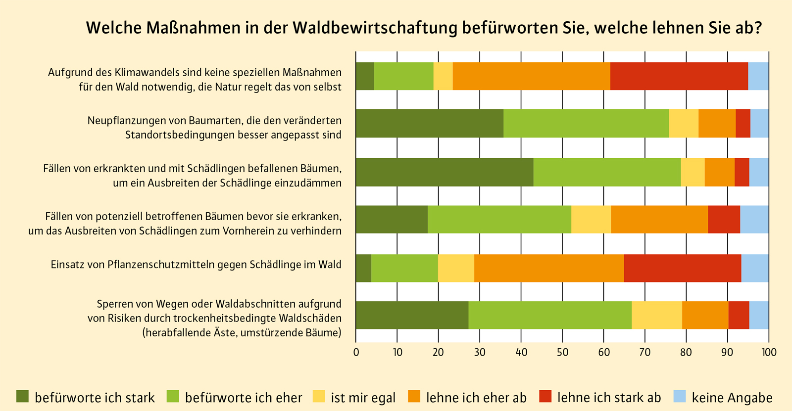 Aus Sicht der Bevölkerung sind Anstrengungen nötig, um den Wald als Kohlenstoffsenke zu erhalten. Fast 90 % der Befragten gab jeweils an, dass ihnen die Bewirtschaftung der Wälder für die CO2-Speicherung (89 %) und den Erhalt der Schutz- und Erholungsfunktion (86,6 %) wichtig ist. Gleichzeitig befürworten über 70 % der Befragten Maßnahmen zur Klimaanpassung von Wäldern (71,7 %). Nur sehr wenigen ist der Wald im Klimawandel egal (4,7 %).