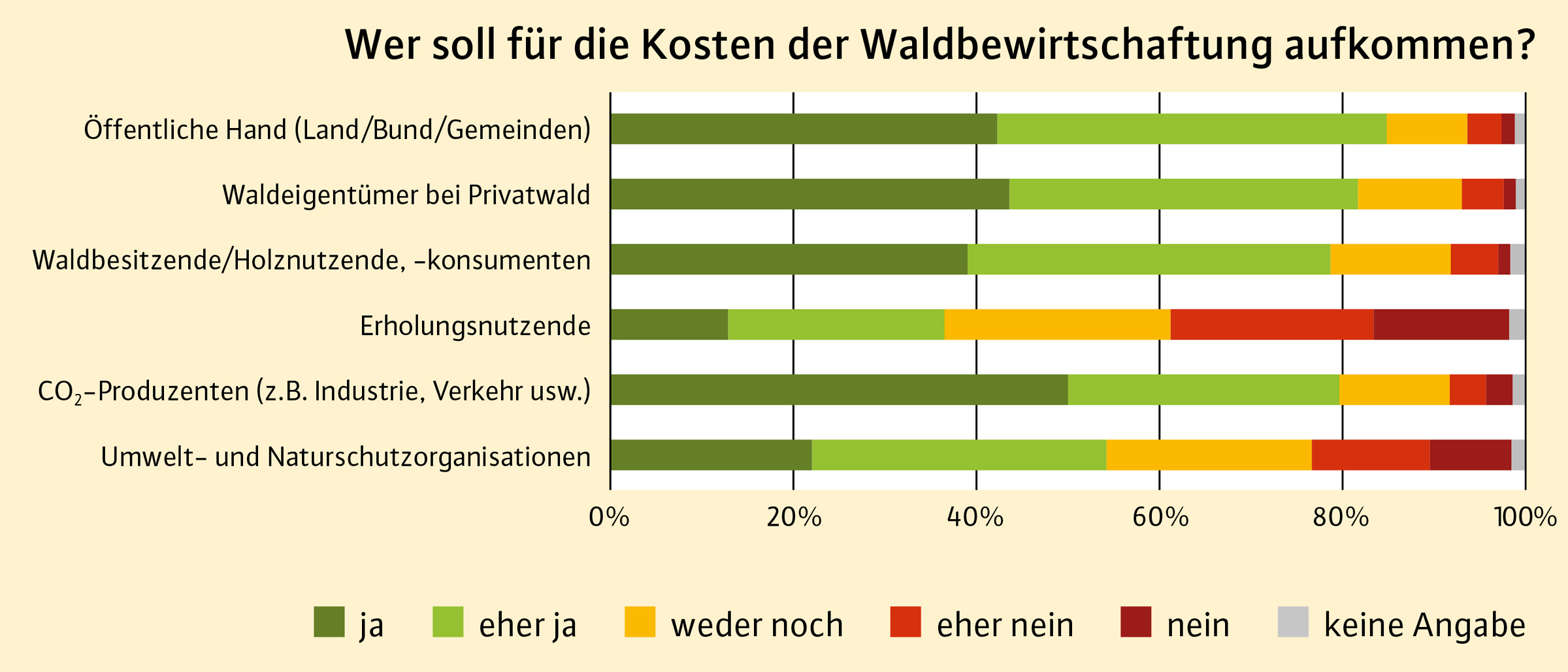 Erholungssuchende hingegen werden nur von rund 37 % der Befragten als Gruppe angesehen, von der eine finanzielle Beteiligung erwartet wird. Gleichzeitig fänden rund die Hälfte der Befragten es angemessen, wenn sich Umwelt- und Naturschutzorganisationen an den Kosten für die Waldbewirtschaftung beteiligen. Teile der Bevölkerung sind offensichtlich überzeugt, dass Forderungen nach Umwelt- und Naturschutz zur Konsequenz haben sollten, daraus entstehende Kosten zu übernehmen.