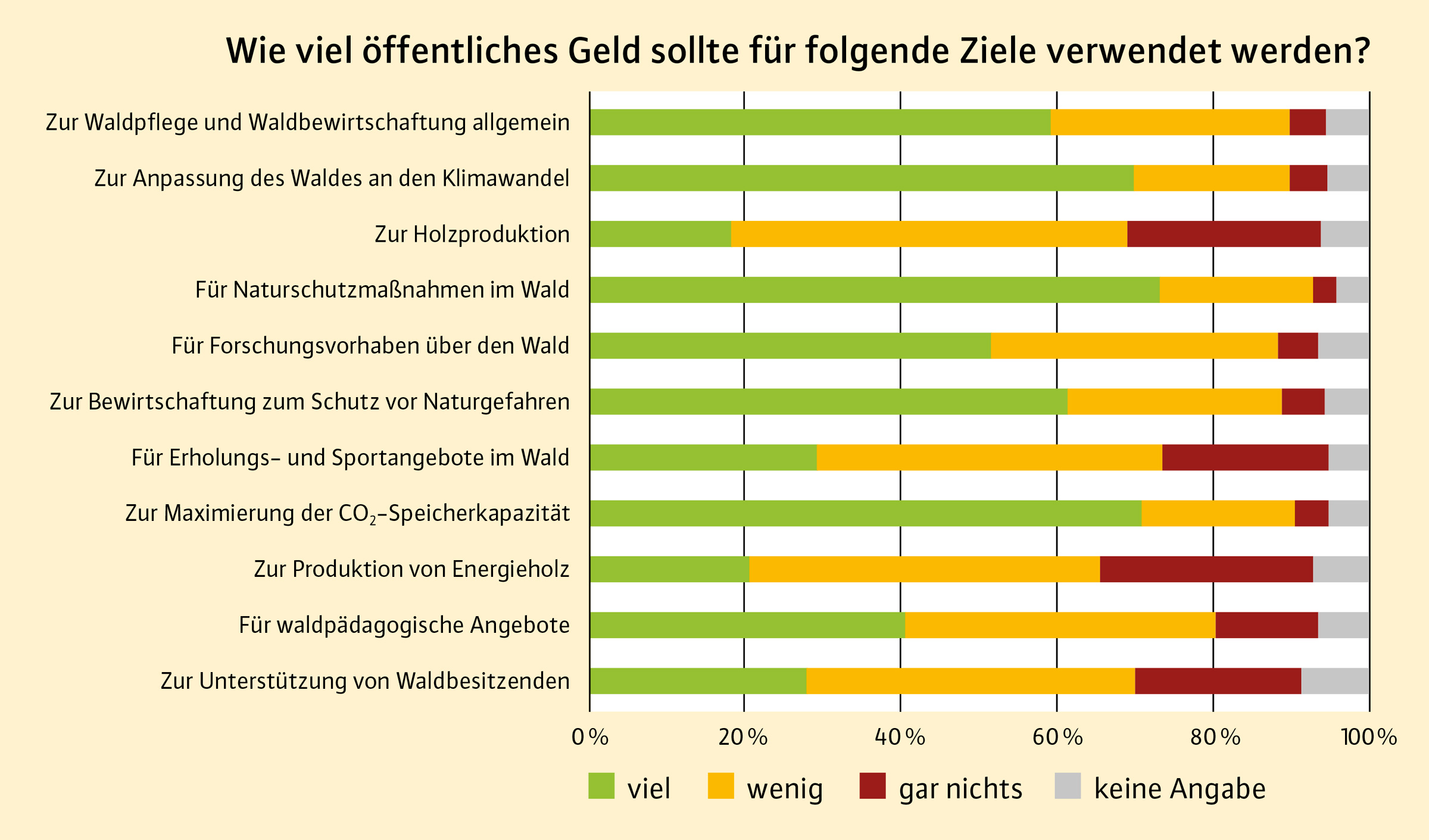 Die Mehrheit der bayerischen Bevölkerung hält die Bewirtschaftung der Wälder für einen wesentlichen Beitrag zum Erhalt deren vielfältiger Leistungen. Daher besteht überwiegend Konsens, dass öffentliche Mittel dafür bereitgestellt werden sollen. Die Kostenübernahme für die Waldbewirtschaftung erachten die Befragten als Gemeinschaftsaufgabe von öffentlicher Hand, Waldbesitzenden, CO2-Produzenten und Konsumenten von Forst-Holz-Produkten. Unterstützung findet insbesondere die Verwendung öffentlicher Mittel für Naturschutzmaßnahmen sowie für Maßnahmen zur Erhöhung der CO2-Speicherkapazität, zur Anpassung von Wäldern an den Klimawandel und zum Schutz vor Naturgefahren. Sofern es für Leistungen des Waldes einen Markt gibt, wird allerdings kein bzw. weniger Bedarf für einen Einsatz öffentlicher Mittel gesehen.