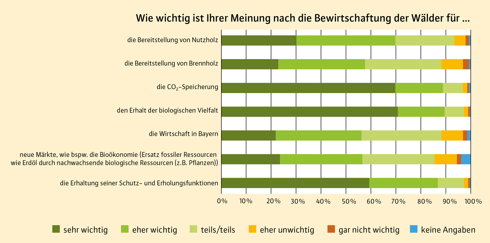 Es sind zwar immerhin noch 44 % der Befragten der Meinung, dass die Menge der Holznutzung gerade richtig ist, aber 40 % der Teilnehmer sagen, dass zu viel Holz genutzt wird. Eine Bewirtschaftung der Wälder zur Holzgewinnung für nachgelagerte Bereiche der Bioökonomie wird also von der Mehrheit der Befragten als wichtig und sinnvoll angesehen. Es zeigt sich aber auch, dass die Bereitstellung von Holz in der Wahrnehmung der Bevölkerung Bayerns nicht mehr die alleinige Legitimation für Forstwirtschaft ist. Besonders sensibel scheinen einige der Bürger*innen auf die Holzeinschlagsmengen zu reagieren. Eine gefühlte Übernutzung des Waldes, beispielweise durch die bei Spaziergängen sichtbaren, großen Polter an beliebten Wanderwegen, schüren die Sorge um einen möglichen Waldverlust.