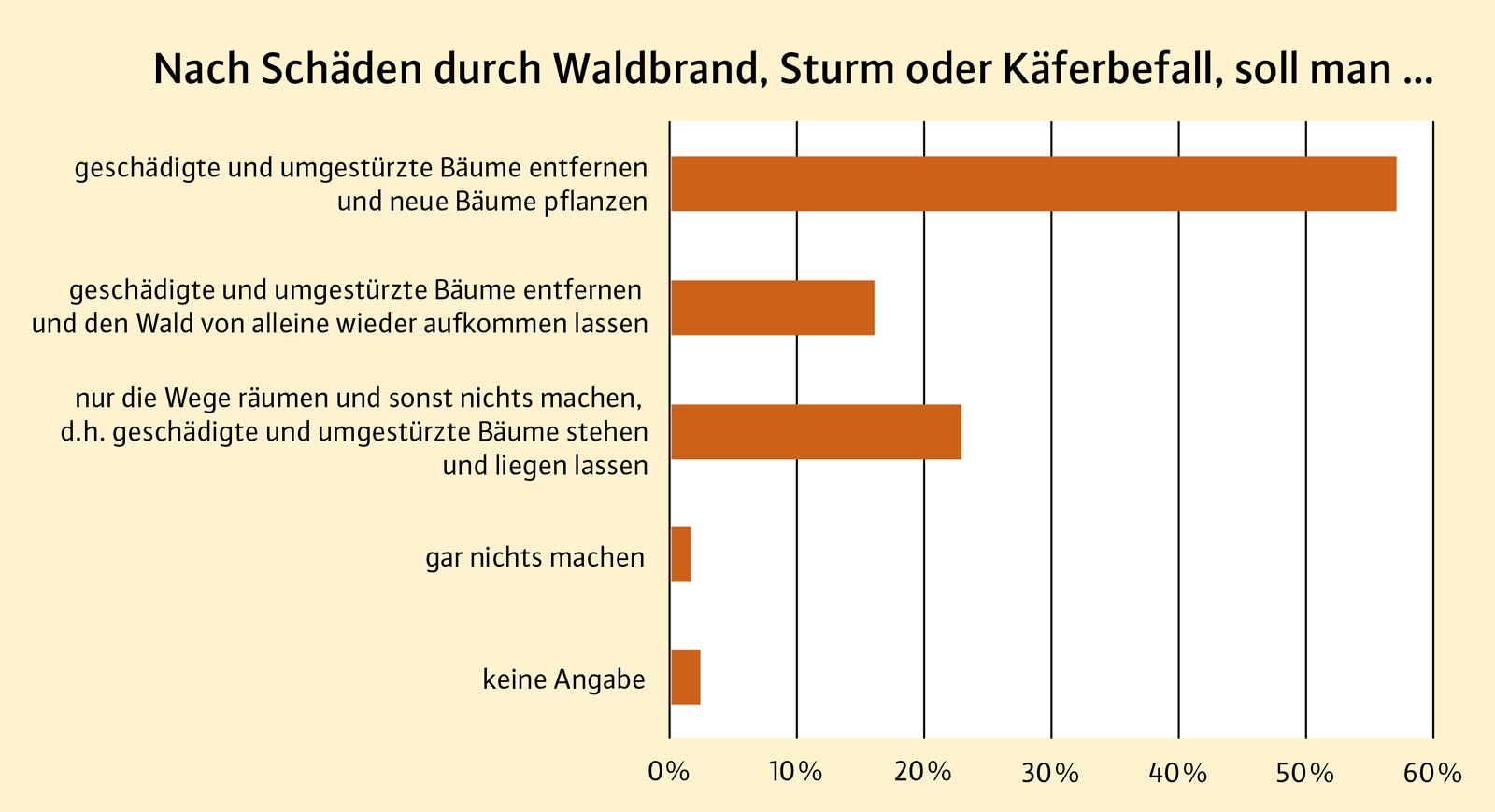 Nach dem Auftreten von Kalamitäten wie zum Beispiel Stürmen, Käfern oder Waldbränden werden Bewirtschaftungsmaßnahmen grundsätzlich als positiv angesehen und eine Unterstützung des Waldes bzw. ein aktives Handeln wird unter bestimmten Umständen als sinnvoll betrachtet (Abb. 8). So wollen 57 % der Befragten, dass geschädigte und umgestürzte Bäume aktiv entfernt und neue Bäume gepflanzt werden.