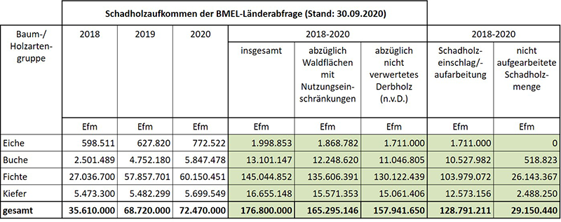 Tab. 1: Schadholzaufkommen der Jahre 2018-2020 gem. Länderabfrage des BMEL, aufgeteilt auf die Holzartengruppen gem. Anteilen des Schadholzaufkommens der jeweiligen Holzartengruppen der Laub- und Nadelbäume in der Holzeinschlagsstatistik.