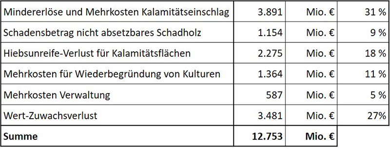Bildet man die Summe über die – keineswegs vollständigen und hier eher vorsichtig bewerteten – forstbetrieblichen Schadenskomponenten der Extremwetterjahre 2018-2020, so ergibt sich ein Schadenbetrag in Höhe von rd. 12,75 Mrd. €.
