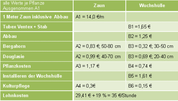Bei der Kalkulation dieser Kosten ist davon auszugehen, dass bei Einzelschutz mit Wuchshülle meist weniger und kleinere Pflanzen gesetzt werden können. Dies führt zu geringeren Kosten für die Pflanzenbeschaffung und für die Pflanzarbeit selbst. Von einer Kulturpflege kann in den ersten Jahren, außer unter besonders schwierigen Verhältnissen (Adlerfarn, Ginster), meist abgesehen werden.