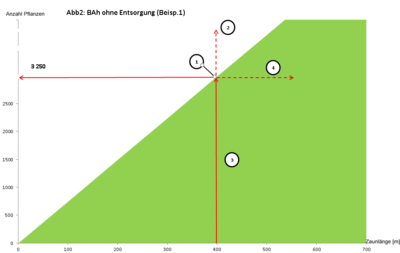 Bei einer Bergahorn Kultur auf 1 ha Größe (ohne Entsorgung) und 400 m Zaunlänge (quadratischer Zaunform) herrscht Kostengleichheit, wenn 400 m × 7,46 = 2.984 Bäumchen gepflanzt werden (Punkt 1). Das entspricht einer Standfläche von 3,4 m2. Werden mehr gepflanzt, befindet man sich in der weißen Fläche oberhalb der Funktionsgeraden und der Zaun ist günstiger (Punkt 2); bei weniger Pflanzen (grüne Fläche) ist jedoch die Tubex Ventex Wuchshülle günstiger (Punkt 3). Hat der Zaun bei 1 ha Fläche jedoch eine Länge von 600 m (Rechteck statt Quadrat), ist ebenfalls die Hülle günstiger (Punkt 4 liegt in der grünen Fläche).