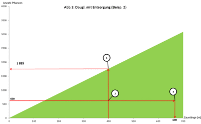 Eine Buchen Naturverjüngung von ca. 1 ha Größe soll mit Douglasien ergänzt werden (mit Entsorgung der Hüllen). Kostengleichheit herrscht bei quadratischem Zaun, wenn 400 m × 4,41 = 1.764 Douglasien gepflanzt würden (Punkt 1). Da aber nur 600 Pflanzen benötigt werden, befindet man sich in der grünen Fläche unterhalb der Funktionsgeraden, wo die Tubex Ventex Hülle günstiger ist (Punkt 2). Tatsächlich handelt es sich aber um keine quadratische Fläche, sondern um ein ungleiches Viereck mit einer Zaunlänge von 680 m von etwa 1 ha Fläche. Der Schnittpunkt 600 Pflanzen × 680 m Zaunlänge (Punkt 3) liegt noch weiter unterhalb der Funktionsgeraden. Der Vorteil der Ventex Wuchshüllen ist somit noch größer.