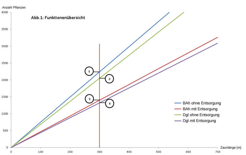 Die Schnittpunkte 1, 2, 3, und 4 der senkrechten Linie in Abb. 1 mit den 4 Funktionen geben an, wo bei einer Zaunlänge von beispielsweise 300 m – unabhängig von der Zaunform – Kostengleichheit mit einer bestimmten Anzahl mit Wuchshülle zu schützender Pflanzen besteht. Liegt die tatsächlich benötigte Pflanzenzahl oberhalb des Schnittpunktes ist der Zaun günstiger, liegt sie unterhalb ist die Wuchshülle kostengünstiger. Wenn sich die Zaunlänge ändert, so sind bei allen kürzeren Längen (links vom Schnittpunkt) Zäune günstiger, bei längeren Zäunen (rechts vom Schnittpunkt) die Tubex Ventex Hüllen. Alle beliebigen Kombinationen von Zaunlänge und Pflanzenzahl, die sich in der Fläche oberhalb der Funktionsgeraden befinden, sind günstiger für die Zaunvariante, während Kombinationen unterhalb der Funktionsgeraden günstiger für die Wuchshülle sind. Zwei weitere Beispiele sollen dies noch näher erläutern.