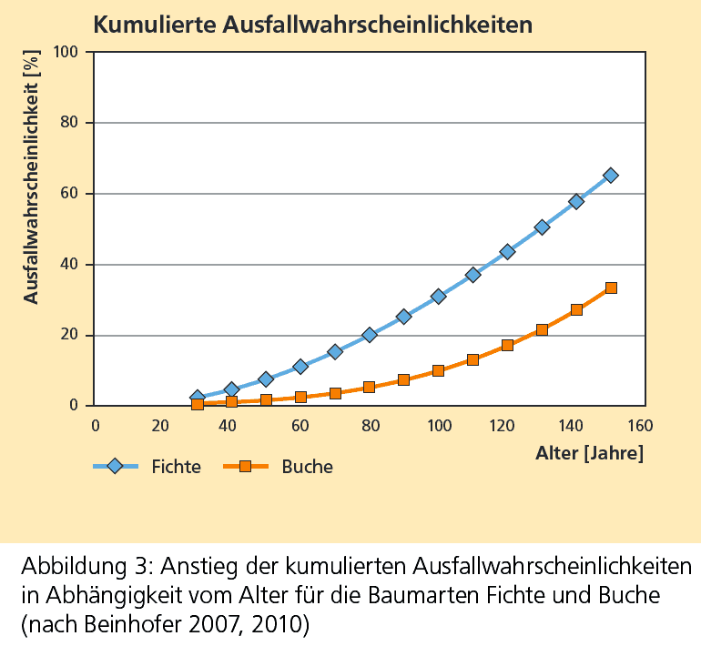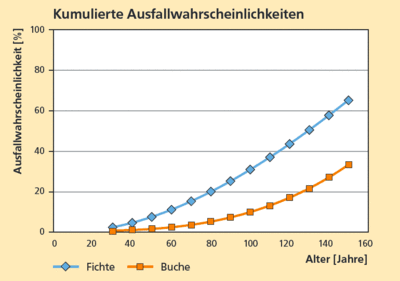 Keine Geldanlage ist ohne Risiko! Auch dem Wald können Stürme, Borkenkäfer, Schneebruch, Trockenschäden und andere Störungen zu schaffen machen. Darüber hinaus spielen Alters-, Baumarten- und Vorratsstruktur eines Waldes eine bedeutende Rolle. Da Bäume mit zunehmendem Alter Umweltrisiken länger ausgesetzt sind, erleben beispielsweise nur 69 Prozent der Fichten das Alter 100, bei der Buche sind es 90 Prozent (Abb. 3).