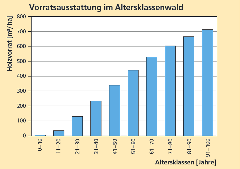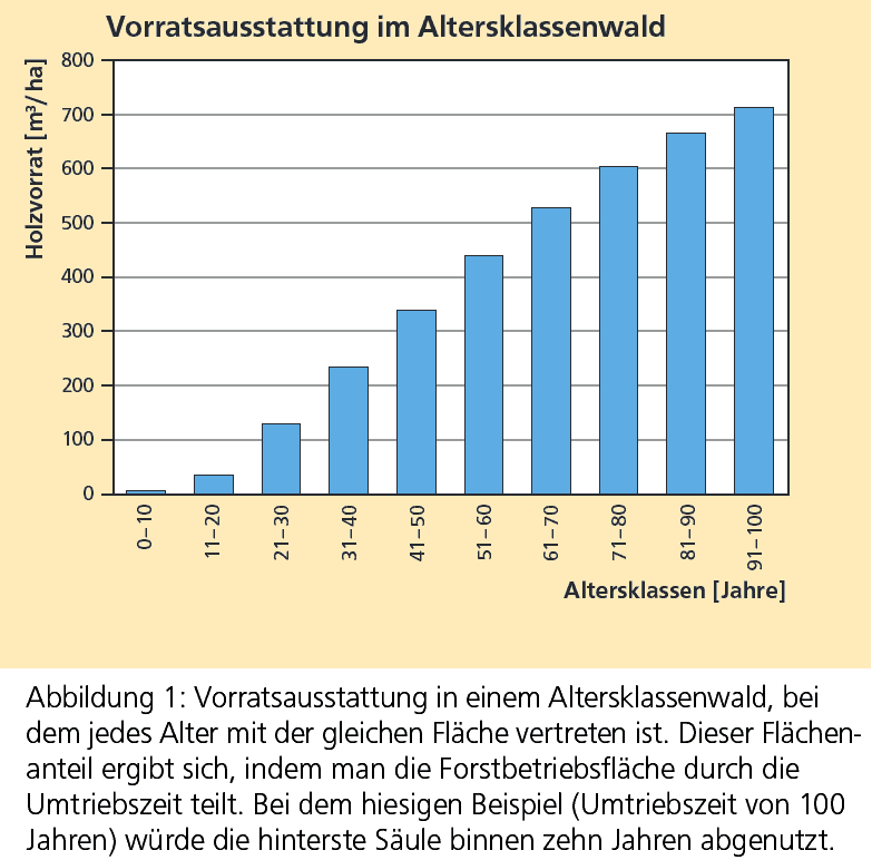 Kleinstprivatwaldbesitzer nutzen den Wald oft als Brennholzlieferanten. Bei einem Verbrauch von etwa zehn Erntefestmetern würde – rein rechnerisch – der jährliche Zuwachs eines Hektars für die Versorgung ausreichen. Allerdings kann der Zuwachs nicht jährlich in dieser Höhe genutzt werden, da "Holz nur an Holz wächst". Man braucht also mehrere Bestände in unterschiedlichen Altersklassen, um jährlich gleichbleibende Nutzungen zu ermöglichen. Bei überwiegend gleichalten Beständen wird daher für jedes Alter die gleiche Flächenausstattung angestrebt. Dann könnte in jedem Jahr die jeweils älteste Fläche geerntet werden (Abb. 1). Dadurch ergibt sich eine Kontinuität der Nutzung, bei der man nicht mehr nutzt als nachwächst. Für den vielerorts als Altersklassenwald strukturierten Kleinstprivatwald kann das allerdings kein Ziel sein.