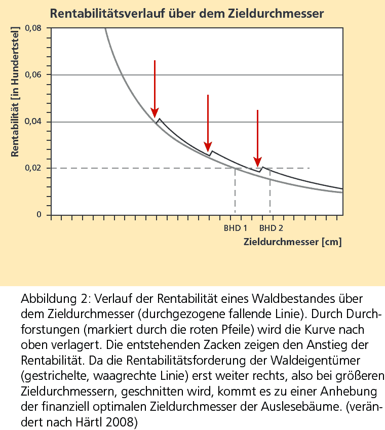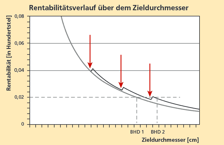 Die Rentabilität eines Bestands steigt durch Durchforstungen also an, bis die Wachstumsreaktionen der geförderten Bäume nur noch schwach ausfallen. Folglich kann die Rentabilität mit Durchforstungen angehoben werden. Die Rentabilität fällt mit zunehmenden Zieldurchmessern ab, Durchforstungen heben die Rentabilität an (Abb. 2). Der finanziell optimale Zieldurchmesser liegt in dem Punkt, in dem die Rentabilitätskurve die Rentabilitätsanforderungen des Waldbesitzers schneidet. Durchforstungsbedingt wird in Abb. 2 der Zieldurchmesser von Punkt BHD 1 auf Punkt BHD 2 heraufgesetzt.