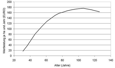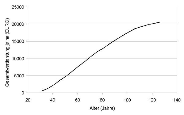 Um zum einen die verschiedenen Durchforstungsvarianten vergleichbar zu machen, andererseits aber auch betriebswirtschaftlich optimale Umtriebszeiten ableiten zu können, wurde die Wertleistung durch Division durch A auf das Bestandesalter umgerechnet (Abb. 2).