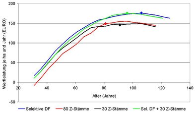 Bei allen Beständen war auffällig, dass die selektive Durchforstung fast über die gesamten Bewirtschaftungszeiträume die höchsten Wertleistungen je ha und Jahr liefert (Abb. 3). Zunächst ist natürlich verständlich, dass die Varianten mit Z-Baum-Auswahl auf Grund der Kosten für die Astung in den ersten Jahren gegenüber der selektiven Durchforstung nur geringere Wertleistungen liefern können. Nur sehr langsam konnten sich diese Kosten amortisieren. Am ehesten gelingt das durch die Kombination von 30 Z-Bäumen mit der selektiven Durchforstung.