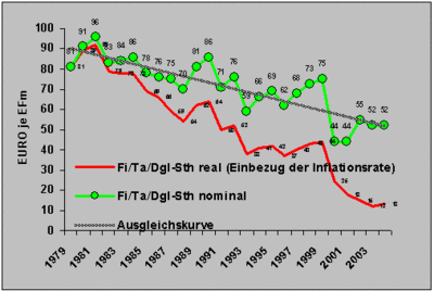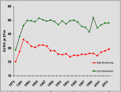 Der durchschnittliche Nadel- Stammholzerlös betrug 2003 lediglich 50 €/Fm. Verglichen mit der Kaufkraft von 1979, entsprächen diese 50 € gerade 12,50 €!