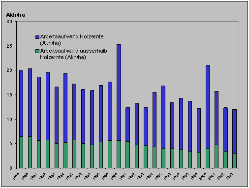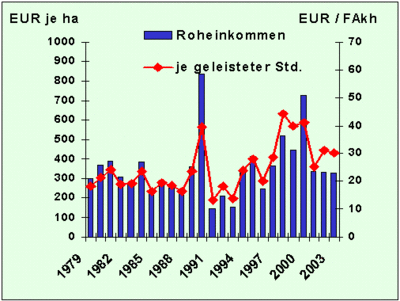 Trotz dieser Misere konnten die Betriebe 2003 ein Roheinkommen von 30 €/Std. oder 330 €/ha erwirtschaften (Abb. 7). Setzt man für die eigene Arbeit einen durchschnittlichen "Lohn" inkl. Nebenkosten in Höhe von 23€/Std. an, wurde im Forstwirtschaftsjahr 2003 ein positives Betriebsergebnis in Höhe von 80 €/ha erreicht. Dies jedoch nur mit Hilfe der Fördermittel, die 83 €/ha betrugen.