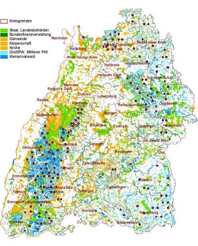 Typisch für Baden-Württemberg ist die innig durchmischte räumliche Verteilung der Waldbesitzarten. Das Land trägt dieser Besonderheit durch Beratung und Betreuung innerhalb eines Kreisforstamtes (zuständig für alle Waldbesitzarten) Rechnung.