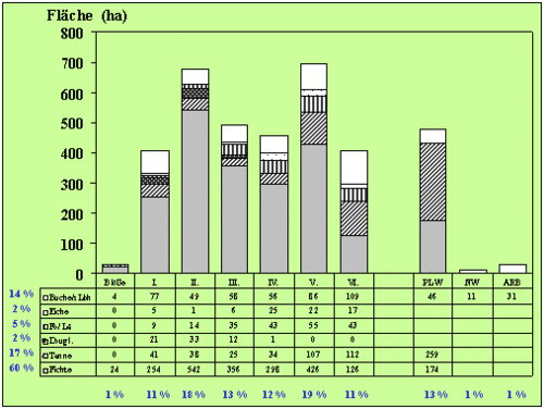 Abb. 4: Die Betriebsgutachten der Testbetriebe weisen eine stark besetzte II. ( 20 bis 40 Jahre alten Bestände) und V. Altersklasse (80 – 100 Jahre) auf. Im Bauernwald finden sich größere Anteile an Plenterwald (viele Altersstufen auf kleiner Fläche).
