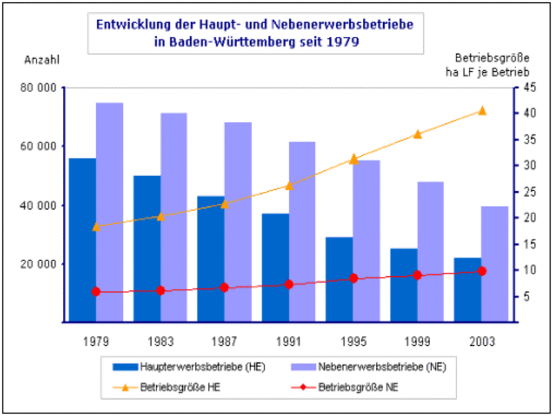 Mit dem rapiden Strukturwandel nach dem 2. Weltkrieg und der darauf folgenden europaweiten Überproduktion traten immer mehr der Tourismus und die Landschaftspflege in den Vordergrund. Die Politik erkannte recht schnell die Gefahr, die durch weiträumige Betriebsaufgaben ausging (Abb. 2). Die Kulturlandschaften samt aufstrebendem Tourismus waren gefährdet. Resultate waren z.B. das Alb- und Schwarzwaldprogramm, baden-württembergische Programme wie das MEKA I und II oder das "Entwicklungsprogramm Ländlicher Raum (ELR)". Speziell für Kleinprivatwaldbesitzer gewährt das Land eine "Ausgleichszulage Wald" in Gebieten mit erschwerter Bewirtschaftung.