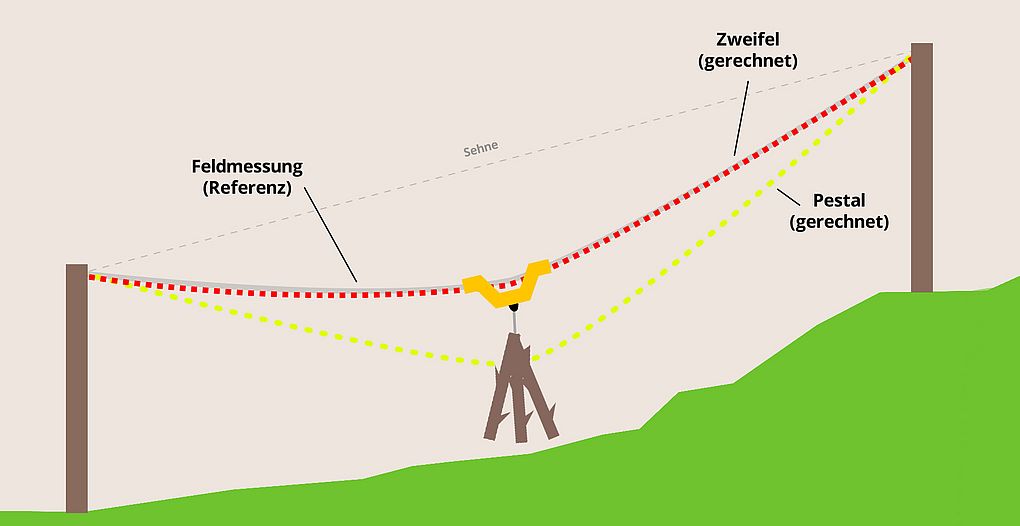 Zurück im Büro an der WSL verglich Bont die Daten mit den von Seilaplan berechneten Angaben. Und tatsächlich: Die Berechnungsmethode nach Zweifel führte zu genaueren Voraussagen der Tragseildurchhänge und der Tragseilzugkräfte als jene nach Pestal (Abb. 4). Für alle Seilfeldlängen lieferten die in Seilaplan integrierten Zweifel-Formeln für den Durchhang eine Genauigkeit von rund +/- einem Meter, was ein sehr gutes Ergebnis ist. Die leichte Überschätzung bei den Tragseilzugkräften ist dabei positiv zu werten, mit ihr ist man bei der Planung auf der «sicheren Seite».