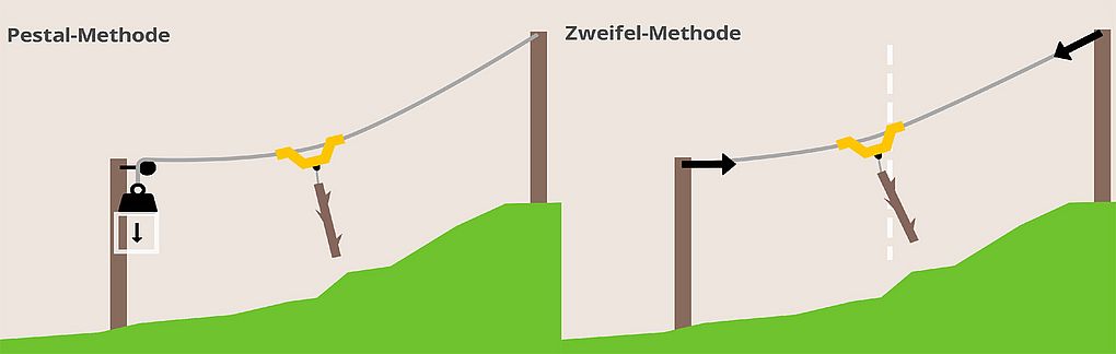Bont und seine Kolleginnen vermassen die gebauten Seillinien und bestimmten die Tragseildurchhänge bei verschiedenen Lasten (Abb. 3). Am Ankerbaum stellten sie die Seilzugkräfte mittels Kraftmessdose fest.