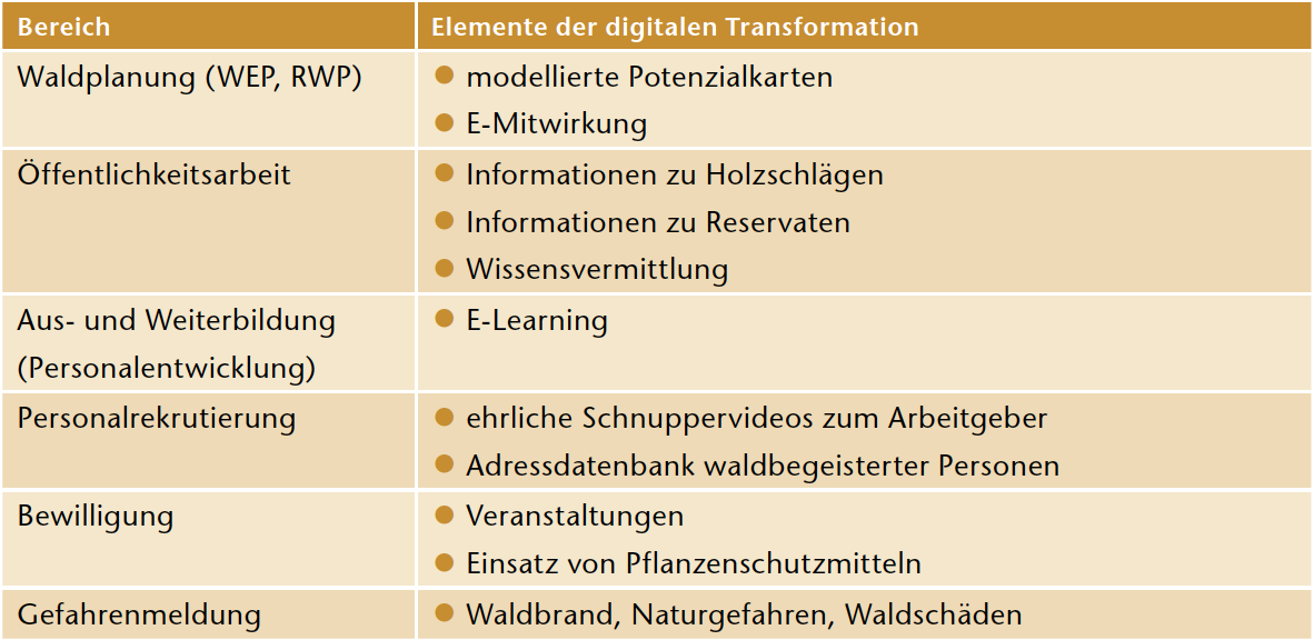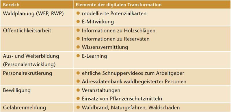 Tab. 1. Weitere Bereiche der digitalen Transformation und deren Elemente im kantonalen Forstdienst.
