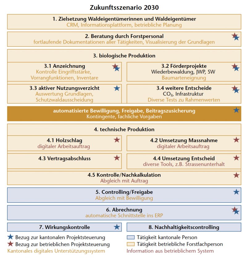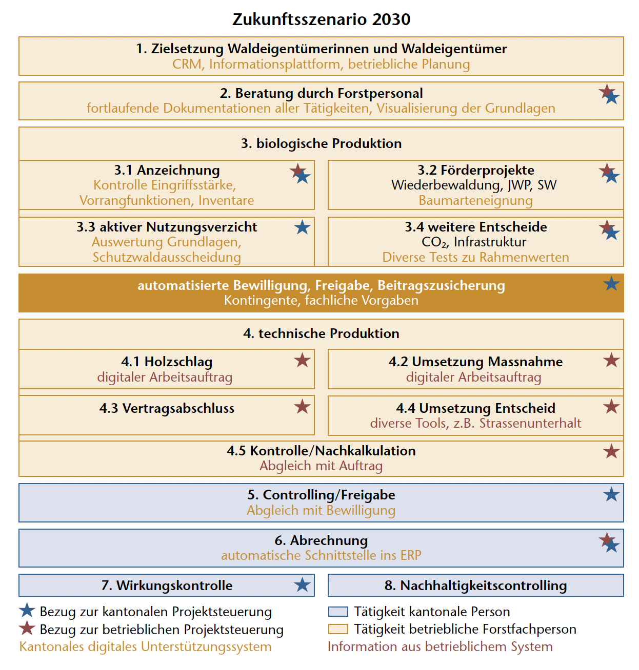 Der wohl markanteste Aspekt im Zukunftsszenario 2030 ist die digitale Unterstützung der verschiedenen Akteure in der Entscheidungsfindung zur waldbaulichen Planung und anschliessenden Ausführung (digitale Unterstützungsprozesse). Durch diese Kundenzentrierung ergeben sich weitreichende Veränderungen der Prozesse und für die Organisation des kantonalen Forstdienstes selbst. Dies beinhaltet, dass die Forstfachperson durch digitale Unterstützungssysteme bei der Anzeichnung direkt auf vorhandene Inventare oder etwaige Vorrangfunktionen aufmerksam gemacht wird. Von der Forstfachperson erteilte Bewilligungen werden bei ausserordentlichen Eingriffsstärken automatisch blockiert und an die Zuständigen des kantonalen Forstdienstes zur Freigabe weitergeleitet. Somit erhält die Forstfachperson zusätzliche Unterstützung und kann allfälliger Kritik schon vor der Bewilligung entgegengetreten. Auch bei der Planung von Förderprojekten stehen der Forstfachperson weitreichende Grundlagen im Unterstützungssystem zur Verfügung. Dadurch werden zum Beispiel bei einer Wiederbewaldung Baumarten für den Standort direkt vorgeschlagen oder die Genehmigung ungeeigneter Baumarten wird verweigert. Vieles wird somit bereits im Wald abschliessend geplant und digital an den kantonalen Forstdienst übermittelt. An Stellen, wo die integrierten digitalen Unterstützungssysteme eine Abweichung der durch den kantonalen Forstdienst definierten Rahmenwerte feststellen, wird automatisch eine auf die spezifische Fragestellung spezialisierte Person der Kantonsverwaltung informiert.