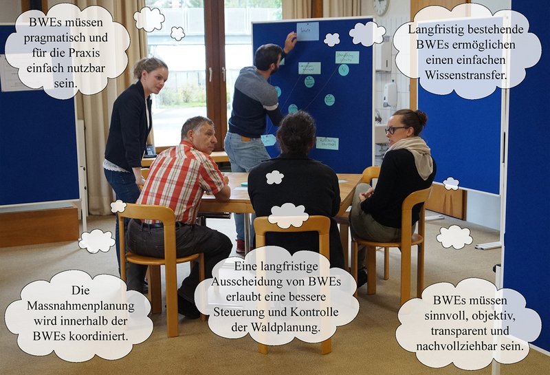 Um die Bedürfnisse der Praxis abzufragen, das vorhandene Know-how zu bündeln und einen Austausch zu ermöglichen, hat die WSL einen Workshop mit 12 Experten und Expertinnen der Waldplanung durchgeführt (Abb. 2). Vertreten waren verschiedene Stakeholdergruppen, von der Betriebsebene über die kantonalen Verantwortlichen bis hin zur Bundesebene, wie auch Lehre und Privatwirtschaft.