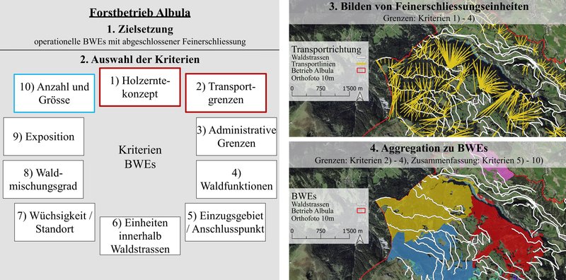 Anhand von zwei sehr unterschiedlichen Betrieben, den Betrieben Albula im Kanton Graubünden und Suhrental-Ruedertal im Aargau, wurde die Methode zur Abgrenzung von BWEs auf ihre Praxistauglichkeit und Flexibilität getestet. Die Ausscheidung der BWEs erfolgt in vier Schritten, die in Zusammenarbeit mit den Planungsverantwortlichen durchgespielt wurden (Abb. 3).