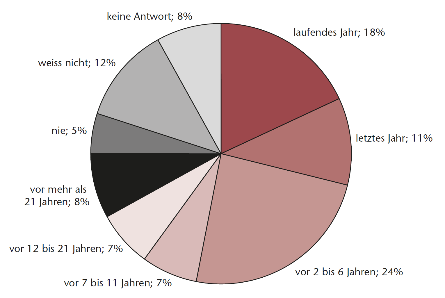 Zwei Drittel der Privatwaldeigentümer bewirtschaften ihren Wald selber (Abb. 2). Nur 13% lassen ihren Wald ausschliesslich durch Dritte bewirtschaften. Ein Sechstel der Privatwaldeigentümer bewirtschaftet den Wald nicht mehr regelmässig. Insgesamt hat nur rund die Hälfte der Privatwaldeigentümer in den letzten fünf bis sechs Jahren Holz im eigenen Wald genutzt, bei rund einem Viertel liegt die letzte Nutzung sieben bis zwanzig Jahre zurück (Abb. 3).