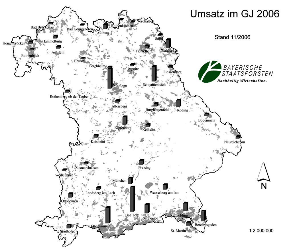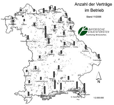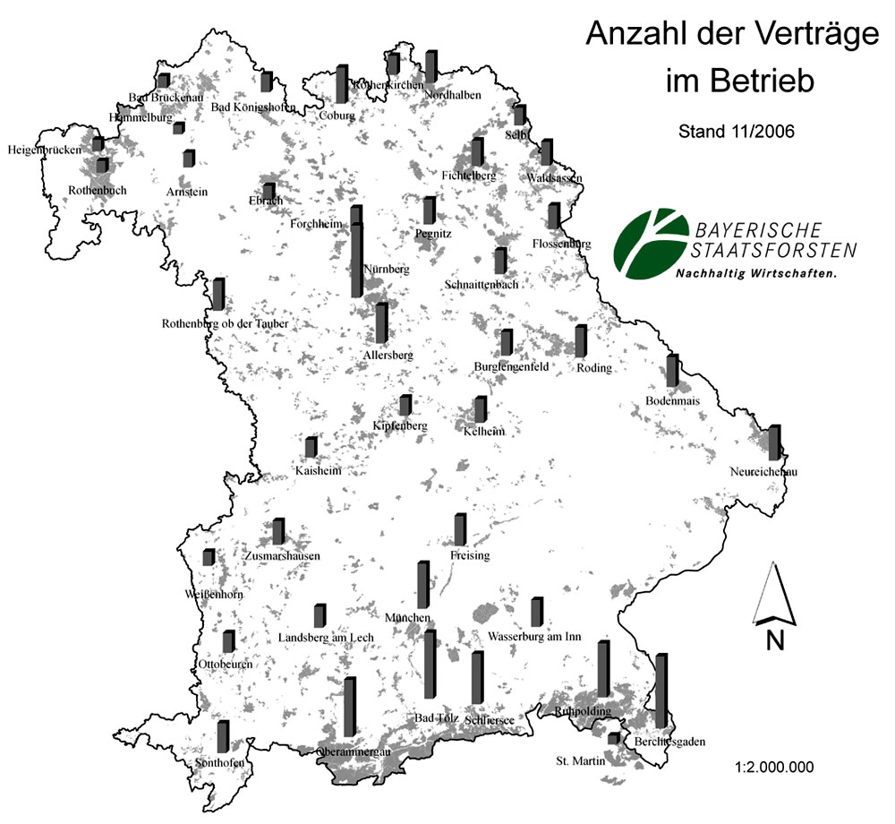 In erster Linie befassen sich die "Weiteren Geschäfte" mit der Verwertung von Grundflächen und Immobilien über die klassische forstliche Nutzung hinaus. Dies beinhaltet jedoch nicht den Verkauf von Grundstücken des Forstvermögens. Bei der Unternehmensgründung am 1. Juli 2005 gingen mehr als 21.000 Verträge wie zum Beispiel Pacht- und Nutzungsverträge von der ehemaligen Staatsforstverwaltung an die BaySF über. Das jährliche Umsatzvolumen dieser Verträge liegt bei etwa 15 Millionen Euro. Auf das gesamte Unternehmen bezogen ergibt sich ein Anteil von ungefähr vier Prozent am Jahresumsatz. Die Abbildungen 1 und 2 zeigen den Zusammenhang zwischen der regionalen Verteilung des Gesamtumsatzes und der Vertragsanzahl in den Betrieben.