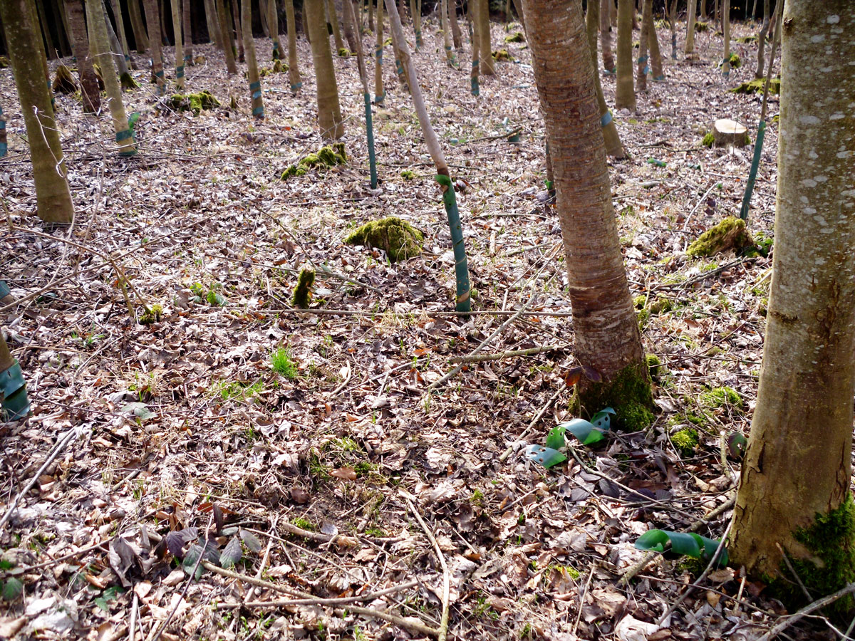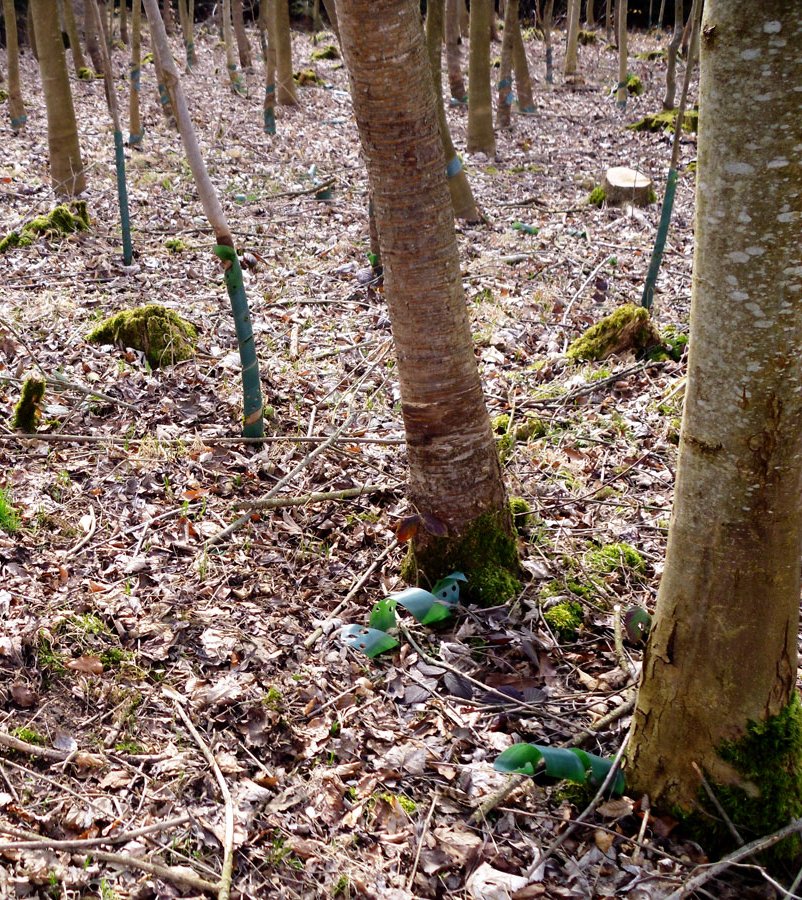 Wer auf Kunststoffprodukte setzen will, sollte möglichst haltbare, mehrfach verwendbare und damit auch wieder aus dem Wald entfernbare wählen. Dokumentieren Sie ihre Schutzmaßnahmen in ihren Unterlagen für ihre eigene Arbeitsplanung bezüglich der späteren Entsorgung, aber auch für ihre Nachfolger. Halten Sie das Jahr der Ausbringung mit dauerhaftem Stift auf dem Produkt fest. Kalkulieren Sie den Abbau und die Entsorgung vorher und bei der Pflege mit ein – anzusetzen für den Abbau ist etwa 1 € pro Fegeschutz oder Wuchshülle.