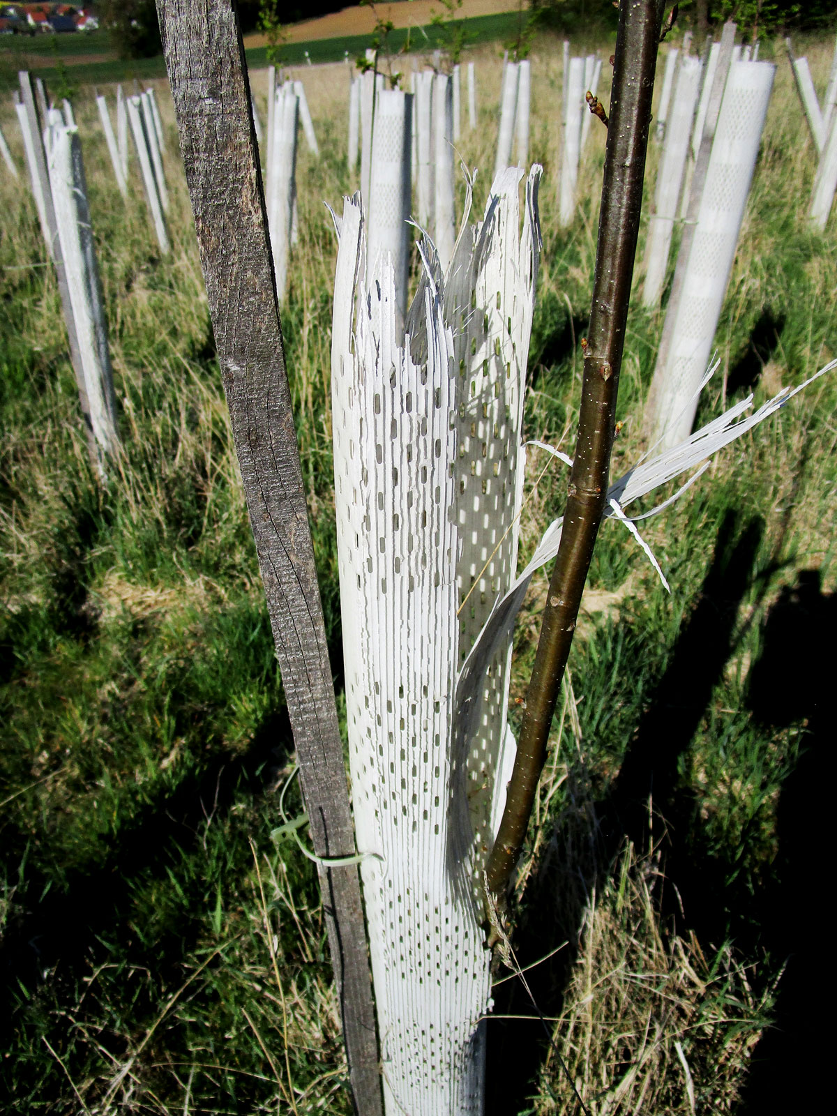 Aber was passiert eigentlich, wenn die Kunststoffe im Wald bleiben? Nachdem die Produkte meist nicht genau gekennzeichnet sind und der Anwender nie weiß, welche Produktcharge welche Zusammensetzung hat, bleibt auch der Zerfallsprozess für den Anwender eine große Unbekannte. Es geht damit los, dass Fegeschutzspiralen entweder nach wenigen Jahren zerbröseln oder aber so stabil sind, dass die geschützten Bäume beim Dickenwachstum eingeschnürt werden und der Baum darüber abknickt.