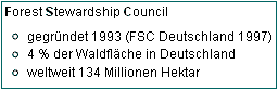- Eine gesamte Region wird danach bewertet, ob die Voraussetzungen für eine nachhaltige Waldbewirtschaftung gegeben sind. Dies erfolgt anhand der geforderten Dokumentation.
