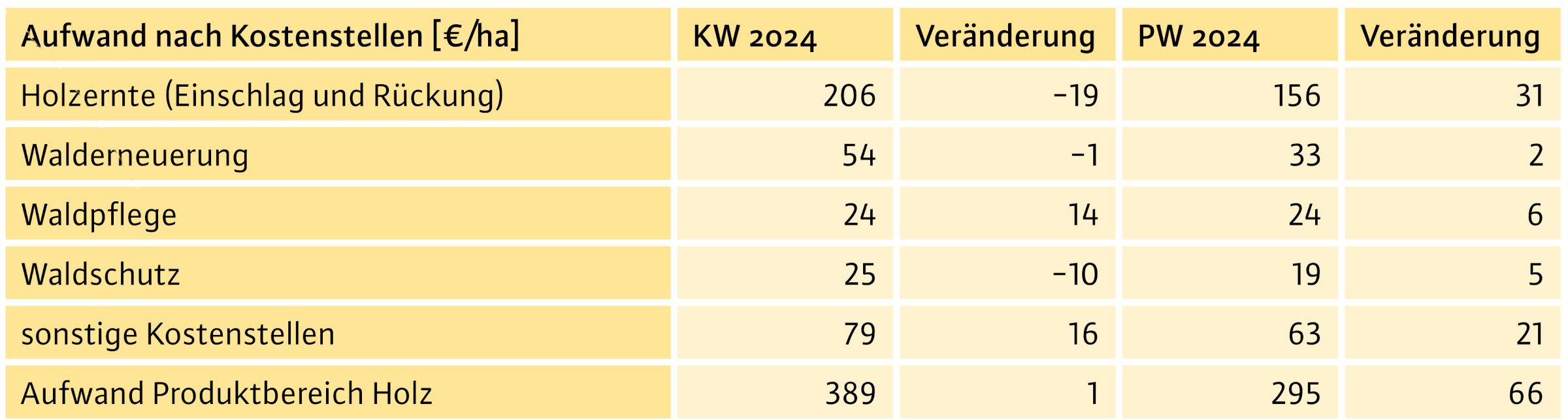 Die Verwaltungskosten im PB1 Holz stiegen um 8 €/ha im Privatwald auf 119 €/ha und im Körperschaftswald um 18 €/ha auf insgesamt 132 €/ha. Diese Entwicklung ist im Wesentlichen auf die allgemeinen Tariflohn- und Gehaltserhöhungen im Jahr 2024 zurückzuführen.