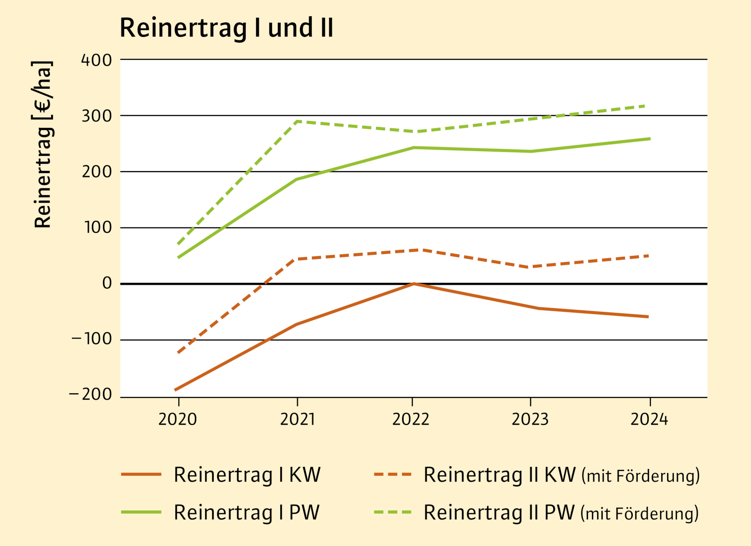 Das Holzgeschäft ist für die teilnehmenden Forstbetriebe mit mehr als 200 ha Größe die bedeutendste Einkommensquelle. Im Kalenderjahr 2024 waren die erzielten Holzpreise etwas geringer als im Vorjahr. Allerdings stieg die Einschlagsmenge je Hektar Holzbodenfläche leicht an. Dies führte zu gestiegenen Erträgen. Gleichzeitig haben sich aber die Betriebsausgaben weiter erhöht. Der Reinertrag I im Großprivatwald war mit 259 €/ha etwas höher als im Vorjahr. Der Kommunalwald lag mit -58 €/ha erneut im Minus. Im Körperschaftswald führten insbesondere die hohen zusätzlichen Ausgaben in den PB2 bis 4 wieder zu einem defizitären Gesamtergebnis. Bezieht man die staatlichen Fördermittel in die Berechnung ein, dann ergaben sich als Reinertrag II 316 €/ha im Privatwald und 49 €/ha im Körperschaftswald. Auch 2024 waren die Forstbetriebsergebnisse für die Mehrzahl der teilnehmenden Betriebe wieder positiv, im Kommunalwald jedoch überwiegend nur mit staatlicher Unterstützung.