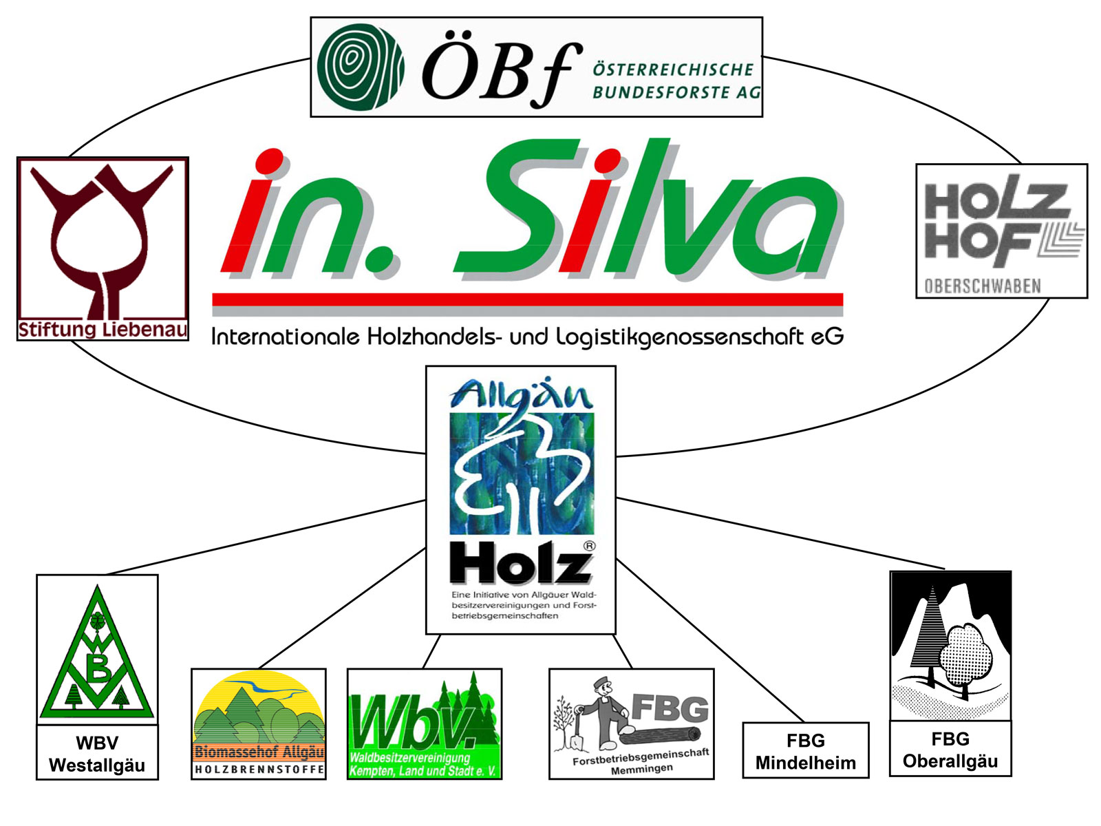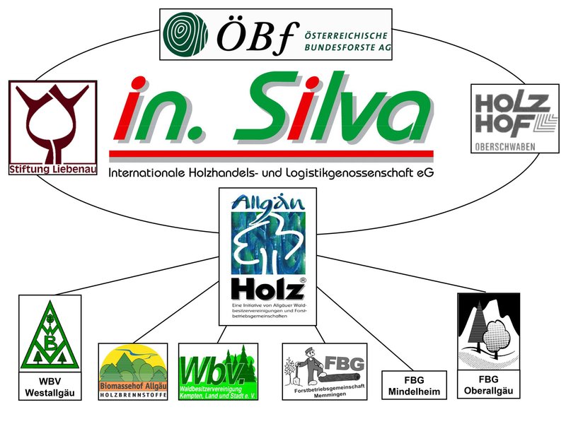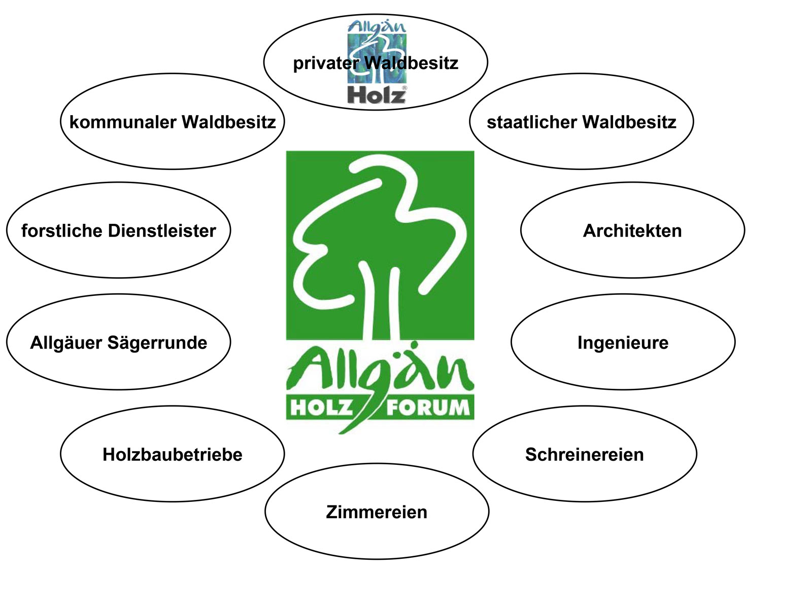 Diese Überlegungen führten im Jahr 2004 zur Gründung der in.Silva eG (Abb. 2), einer internationalen Holzhandels- und Logistikgenossenschaft. Gründungsmitglieder sind die forstlichen Zusammenschlüsse des Allgäuholz Markenverbandes e.V., die Holzhof Oberschwaben eG, die Stiftung Liebenau und die Österreichische Bundesforste AG. Die in.Silva eG kauft und bündelt die Massensortimente der Genossenschafts- mitglieder und liefert diese frei Werk an Zielkunden. Die noch weitergehende Zusammenfassung der Massensortimente bietet bessere Marktkonditionen und ein kompaktes Servicepaket für die Holzindustrie (Lieferpläne, Logistikdienstleistung, Versorgungssicherheit). Um den Rohstoff Holz besser zu vermarkten, ist es aus der AllgäuHolz-Idee heraus gelungen, alle an der Wertschöpfungskette "Holz" im Allgäu beteiligten Gruppen im HolzForum Allgäu e.V. (Abb. 3) einzubinden. Der private, kommunale und staatliche Waldbesitz, forstliche Dienstleister, die Allgäuer Sägerrunde, Holzbaubetriebe, Zimmereien, Schreinereien, Ingenieure und Architekten bilden die Gründungsgruppe. Die Arbeit der Wertschöpfungskette verleiht dem Holzbau ein eigenes Gesicht. Die Erfolge sind bereits in einer Zunahme der Holzbauten im Allgäu und einer beginnenden Netzwerkbildung der im Holzbau tätigen Betriebe und Akteure zu spüren.
