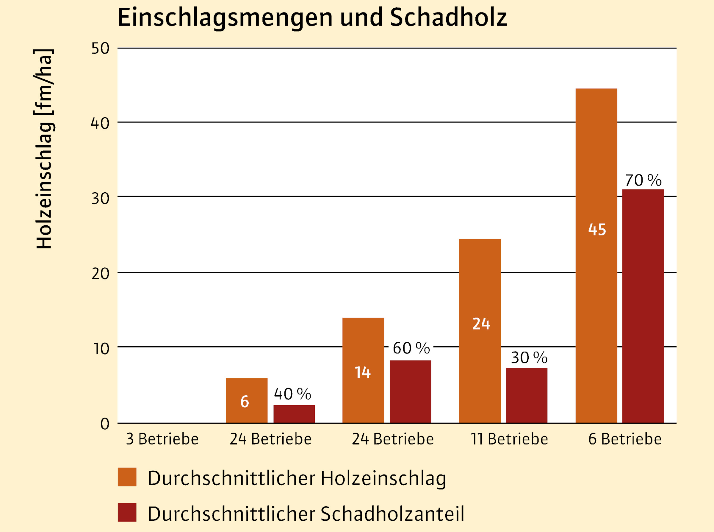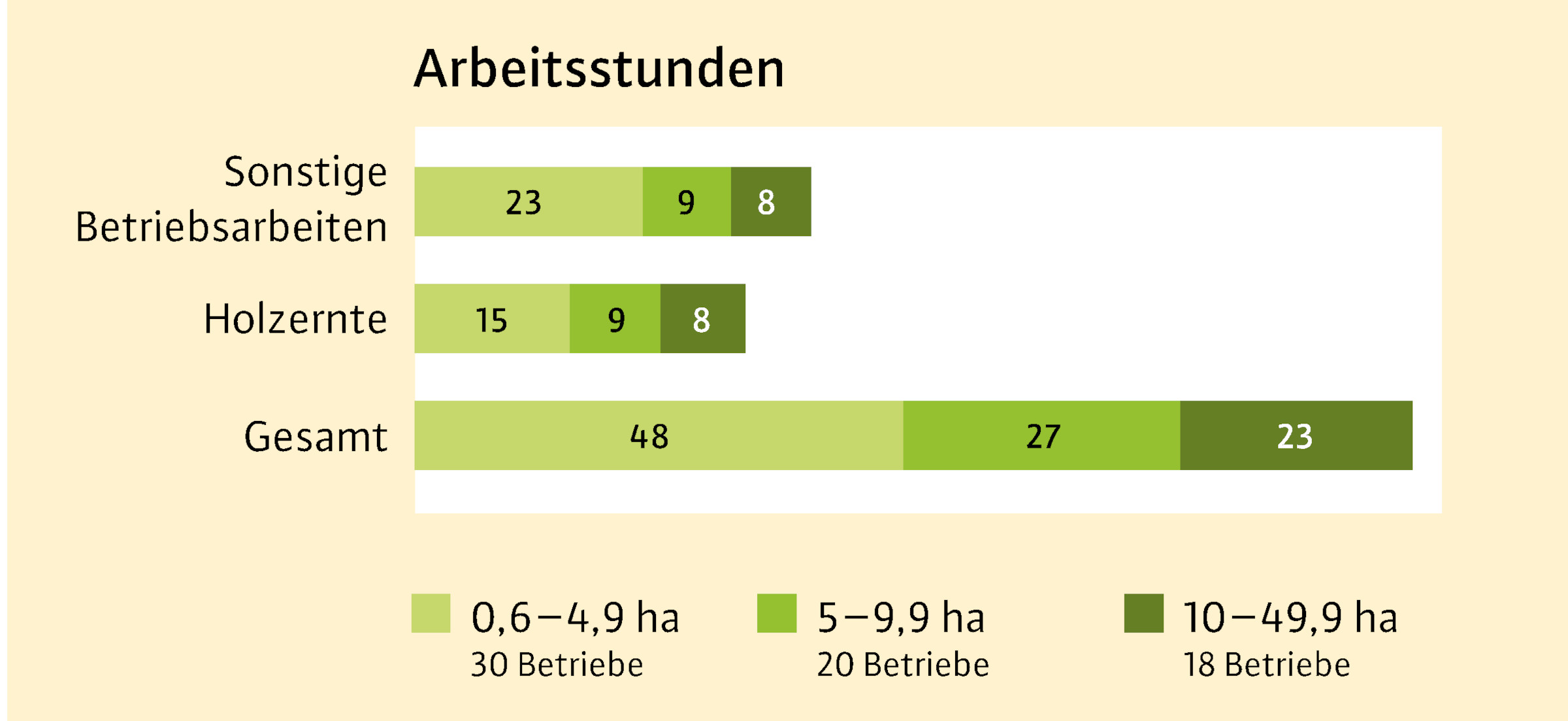 Die Anzahl der in Eigenleistung erbrachten Arbeitsstunden im Wald schwankte deutlich. So lag der niedrigste angegebene Wert bei 1,6 Stunden je ha (in einem Betrieb mit 17 ha Waldfläche) und die Höchststundenzahl bei 253 Stunden je ha (in einem Betrieb mit knapp über einem Hektar).