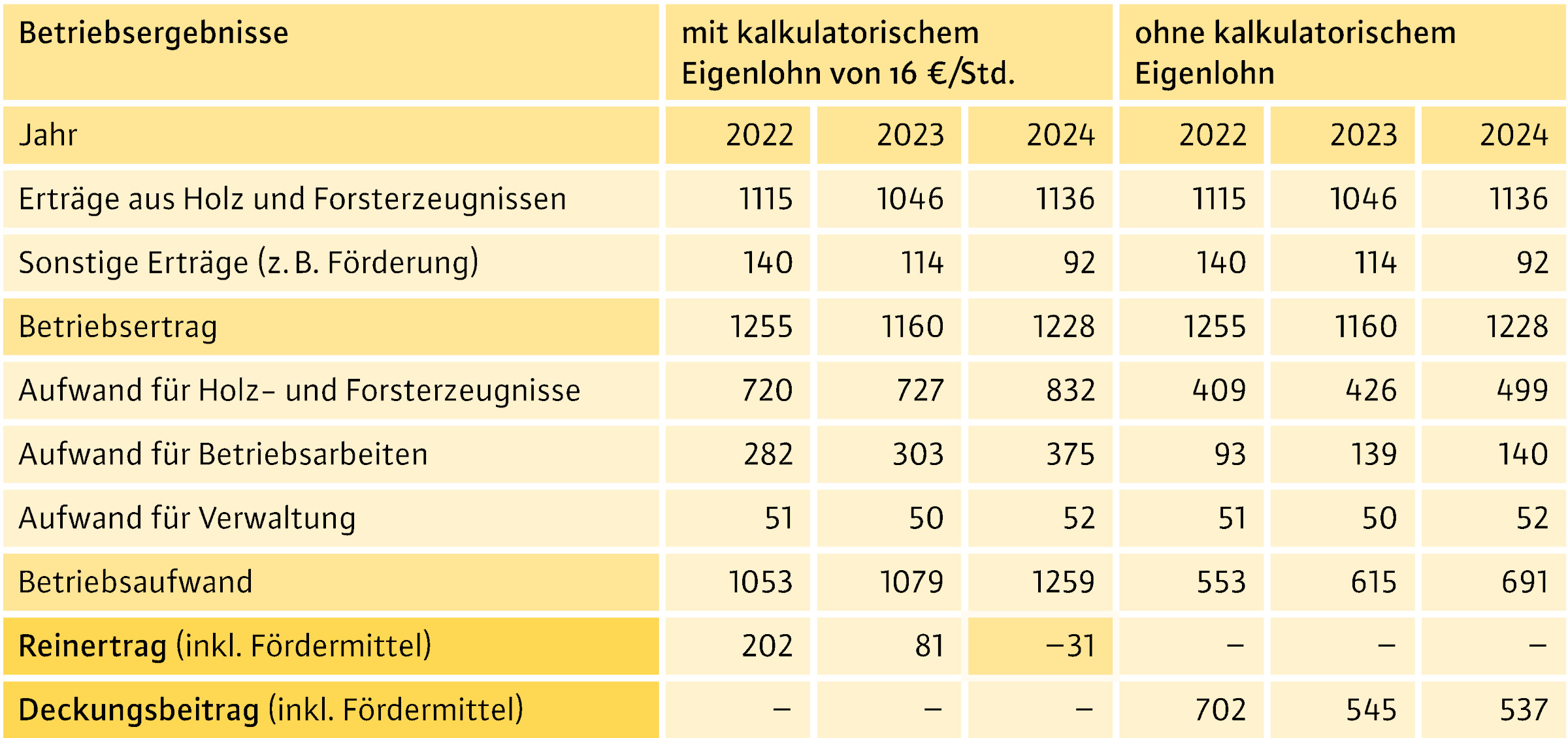 Der Holzertrag jedes Betriebes setzt sich aus den tatsächlichen Verkaufserlösen und den kalkulatorischen Werten für den Eigenverbrauch zusammen. Die kalkulatorischen Lohnkosten für die eigene Arbeit und unentgeltlich beschäftigte Personen wurden konservativ mit 16 Euro in der Stunde angesetzt, da diese sowohl leichte Tätigkeiten wie die Borkenkäfersuche als auch die manuelle Holzernte abbilden sollen. Den Dieselpreis für die eigenen Maschinen hinterlegte man mit 1,80 Euro brutto je Liter. Fremdarbeitskosten, Maschinenmiete oder Materialkosten sind mit dem tatsächlich entstandenen Rechnungsbetrag in die Kalkulation eingeflossen. Als Verwaltungskosten wurden nur die Pflichtbeiträge zur landwirtschaftlichen Sozialversicherung und der Jahresmitgliedsbeitrag bei einem forstlichen Zusammenschluss angesetzt.