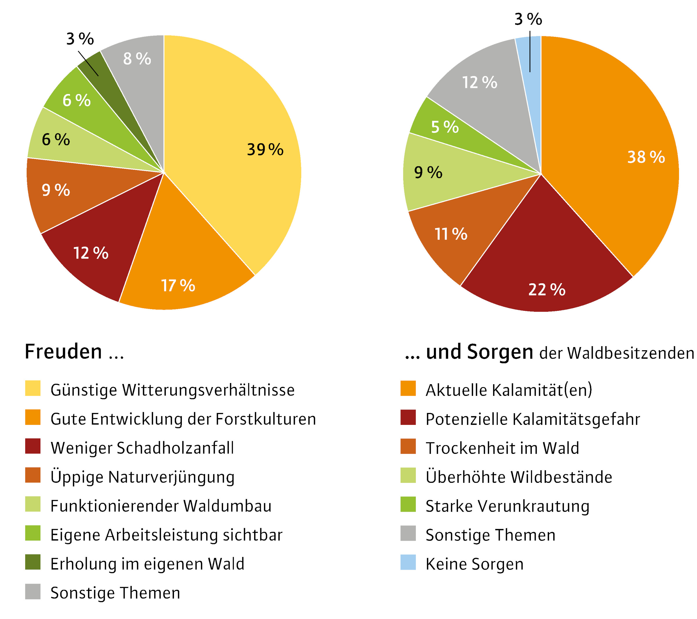 Die Waldbesitzenden investieren allgemein viel Zeit und Geld in die Bewirtschaftung ihrer Waldflächen. Die Abteilung “Wald und Gesellschaft” wollte zusätzlich erfahren, was den Teilnehmenden explizit im Befragungsjahr an ihrem Wald Freude bereitet hat und worüber sie sich Sorgen gemacht haben. Dazu wurden zwei kurze Fragen im Rahmen der telefonischen Interviews gestellt. Jede befragte Person aus jedem Betrieb sollte nur den, aus ihrer Sicht, jeweils wichtigsten Aspekt nennen. Die zwei Kreisdiagramme (Abbildung 7) zeigen, dass die Waldbesitzenden meist ähnliche Dinge bewegten. Gesondert dargestellt sind nur Themen, die von mindestens drei Personen genannt wurden.