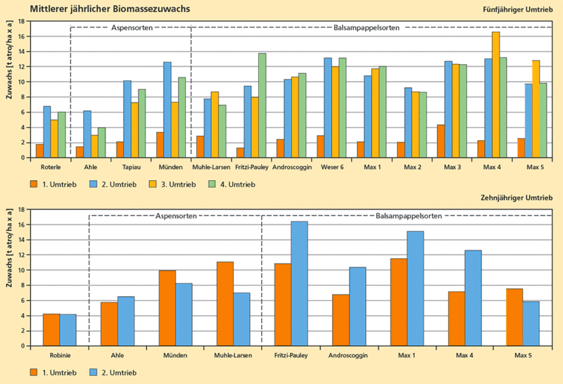 - Im zehnjährigen Erntezyklus sind höhere Erträge als im fünfjährigen Umtrieb zu erwarten.