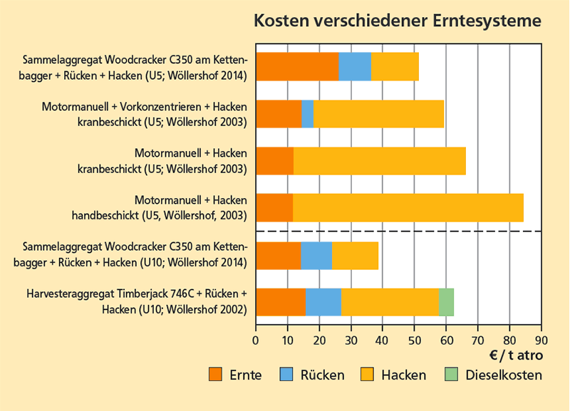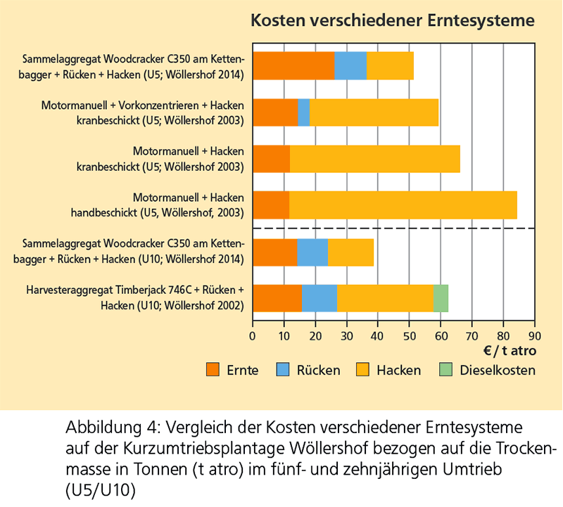 Im fünfjährigen Umtrieb ist die Motorsäge am günstigsten. Das Vorkonzentrieren der Stämme bzw. Rücken zum zentralen Hackplatz führt zu einer wesentlichen Kostenersparnis beim Hacken. Im zehnjährigen Umtrieb kann es sich aufgrund des Stück-Masse-Gesetzes auch in KUPen lohnen, hochmechanisierte Forsttechnik einzusetzen (Abb. 4).