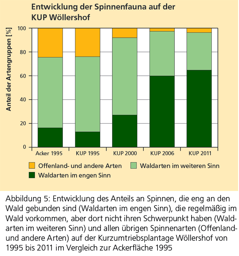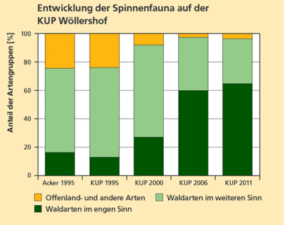 Die Spinnenfauna auf den Versuchsflächen und angrenzender Vergleichsflächen wurde mehrfach untersucht. Insgesamt wurden 119 Spinnen-, elf Weberknecht- und drei Pseudoskorpionarten auf der Versuchsfläche nachgewiesen, darunter auch Rote-Liste-Arten. Die Zusammensetzung der Fauna änderte sich mit der Zeit deutlich und die Sukzession der Spinnenzönosen ist auch nach 20 Jahren noch nicht abgeschlossen. Die anfängliche Ackerfauna hat sich deutlich in Richtung einer Waldfauna entwickelt (Abb. 5). Die Zahl eng an den Wald gebundener Arten ist auf der Versuchsfläche aber auch jetzt noch niedriger als in den angrenzenden Waldbereichen.