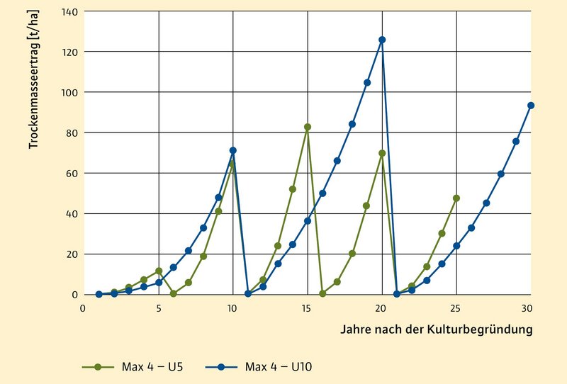 In Abbildung 2 ist die Wuchsdynamik des Balsampappelklons Max 4 in Abhängigkeit von der gewählten Umtriebszeit dargestellt. Deutlich zu erkennen sind die schwächeren Zuwächse in der ersten Umtriebszeit. Diese Startschwierigkeiten sind durch das noch nicht entwickelte Wurzelsystem und die wuchsstarke Konkurrenzvegetation bedingt. Ab der zweiten Rotation werden im fünfjährigen Umtrieb Erträge von über 60 t/ha erreicht. Im zehnjährigen Umtrieb wird die schwache Initialphase durch die längere Standzeit etwas relativiert. Aber auch hier ist die zweite Umtriebszeit mit einem Biomasseertrag von 130 t Trockenmasse/ha deutlich ertragreicher als die erste Rotation. Bei beiden Rotationslängen sinken nach 20 Jahren die Erträge der Pappelsorte Max 4 ab – im fünften fünfjährigen Bestand auf 50 t und in der dritten zehnjährigen Rotation auf 95 t Trockenmasse pro Hektar. Eine ähnliche Entwicklung ermittelten Pecenka et al. (2023), die beim Anbau von Max 4 im vierjährigen Ernteturnus nach einem Ertragsmaximum bei 20 Jahren ein Absinken der Erträge feststellten.