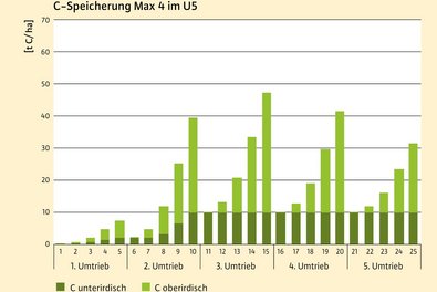 Die Kohlenstoffspeicherung in Kurzumtriebsplantagen ist von Faktoren wie Baumart, Umtriebszeit und Pflanzdichte abhängig. Im Folgenden werden wir die Kohlenstoffsequestrierung des Pappelklons Max 4 auf der 1992 begründeten KUP-Versuchsfläche Wöllershof in der Oberpfalz betrachten. Der häufig angebaute Klon wurde sowohl mit einer Pflanzzahl von 6.600 Stück/ha für einen fünfjährigen Erntezyklus als auch mit einer Pflanzzahl von 3.300 Stück/ha für die zehnjährige Rotation begründet. In der ältesten durchgehend bewirtschafteten Plantage Bayerns konnten fünf fünfjährige und drei zehnjährige Rotationsperioden in die Betrachtung mit einbezogen werden.