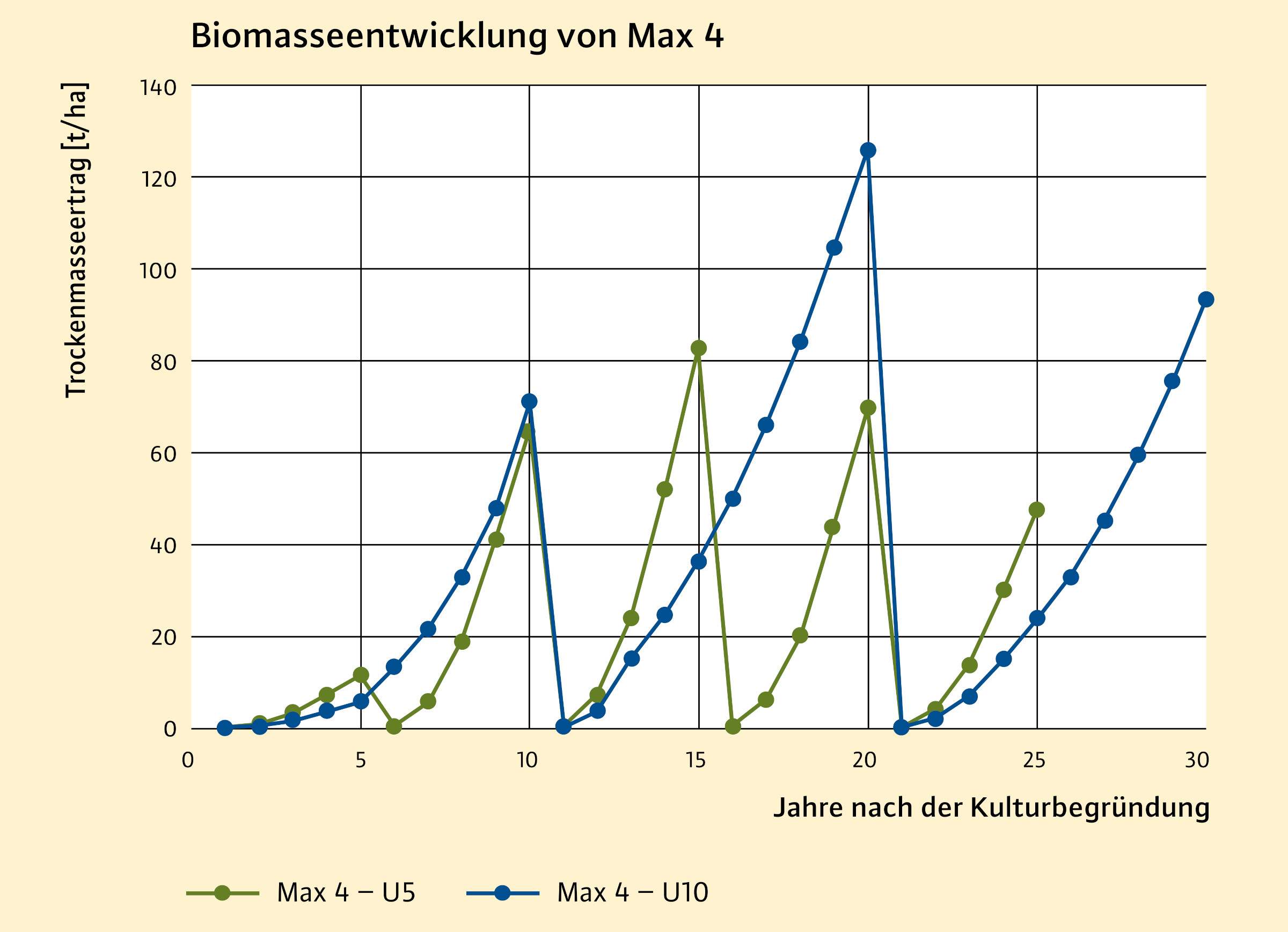 Die Berechnung der Biomasseentwicklung zwischen den Ernten erfolgt in Anlehnung an Daten von Strobl (2007), der auf jährliche Erhebungen der stehenden Biomasse in den ersten fünf Jahren zurückgreifen konnte und daraus den prozentualen Beitrag der einzelnen Wachstumsjahre zur Gesamtbiomasseleistung herleitete. Die Ertragsdaten des zehnjährigen Max-Klons wurden unter Zuhilfenahme der Biomasseerhebung am Ende der zehnjährigen Rotation und der Wachstumskurven des fünfjährigen Bestandes interpoliert. Hierbei wurde die Annahme getroffen, dass bei einer halbierten Pflanzzahl der Biomassezuwachs in den ersten Wuchsjahren ebenfalls die Hälfte des im fünfjährigen Umtrieb ermittelten Zuwachses beträgt.