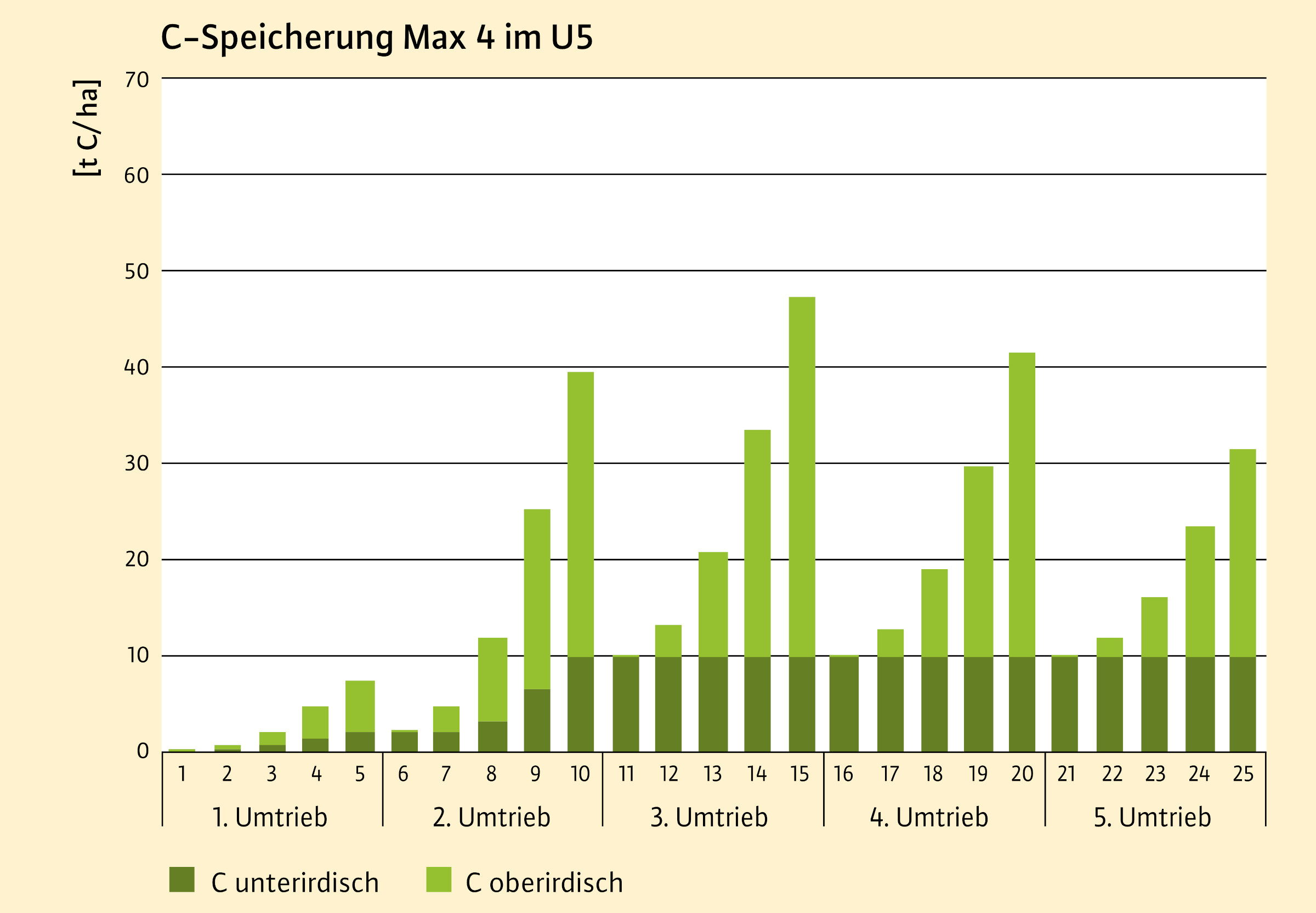Ein Vergleich mit anderen KUP-Flächen zeigt, dass die Wuchsleistung im ersten Umtrieb deutlich höher sein kann. So wurde auf einer LWF-Versuchsfläche in Niederbayern bei Max 4 ein Ertrag von 42 t atro/ha im ersten fünfjährigen Umtrieb erzielt – bei vergleichbaren Biomasseerträgen der Folgerotationen wie in Wöllershof. Unter der Voraussetzung eines erfolgreichen Begleitwuchsmanagements ist deshalb von einer durchschnittlichen Kohlenstoffspeichermenge von 18,56 t C/ha im fünfjährigen Umtrieb auszugehen. Im zehnjährigen Umtrieb in Wöllershof beträgt die mittlere Kohlenstoffspeicherung 24,11 t C/ha bei Betrachtung von drei Rotationen. Hier erhöht sich unter der Annahme einer reibungslosen Kulturbegründung die durchschnittliche Kohlenstoffspeicherleistung auf 25,77 t C/ha. Lange Standzeiten von Kurzumtriebsplantagen sind somit nicht nur bezogen auf die Begründungs- und Rückumwandlungskosten wirtschaftlich sinnvoll, sondern bewirken auch eine längere Fixierung von Kohlenstoff in der Biomasse.