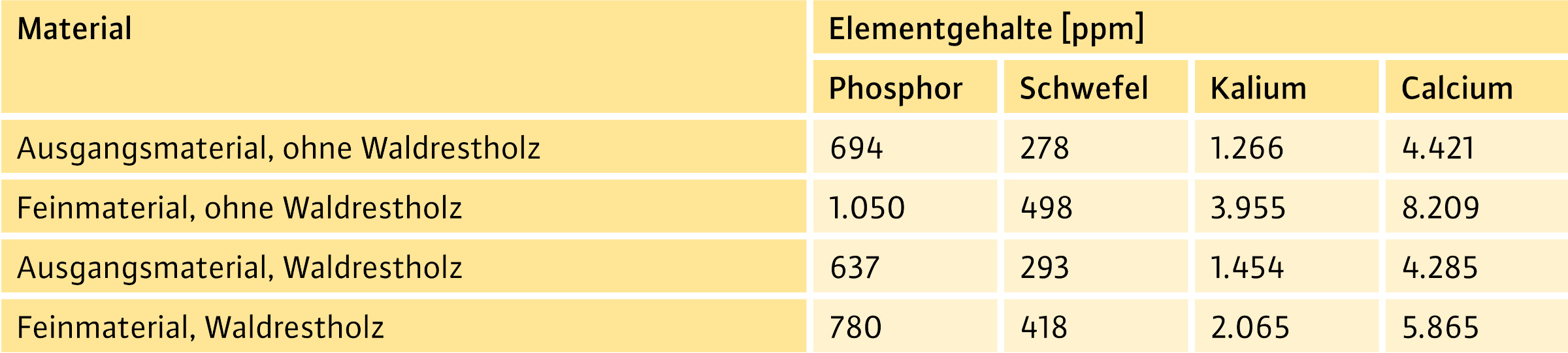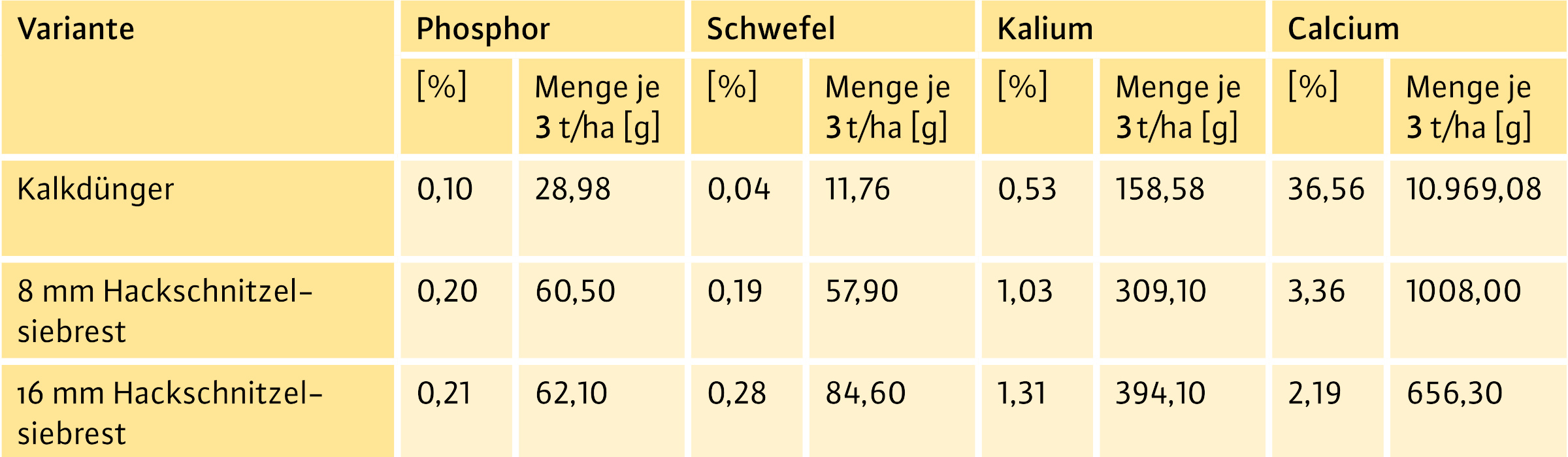 Bei der Ausbringung wurden in einem ca. 75-jährigen Fichtenaltbestand (Abbildung 4) und einem rund 40-jährigen Fichtendurchforstungsbestand (Abbildung 5) jeweils fünf Ausbringungsvarianten (Kontrollfläche, Hackschnitzelsiebrest 8 mm und 16 mm, Hackschnitzelsiebrest 8 mm mit Mykhorriza sowie Kalkdünger und Holzasche) getestet. Die Gehalte an Phosphor, Kalium und Schwefel waren bei den Hackschnitzelsiebresten sogar teils deutlich höher als im Kalkdünger. Lediglich der Calciumgehalt war mit rund 37 % (äquivalent zu ca. 10 kg je 3 t) im Kalkdünger weit höher als in den Hackschnitzelsiebresten, was aufgrund des hohen Gehalts an CaO (Calciumoxid) und CaCO₃ (Calciumcarbonat) im Kalkdünger ein erwartbares Ergebnis ist (Abbildung 6).